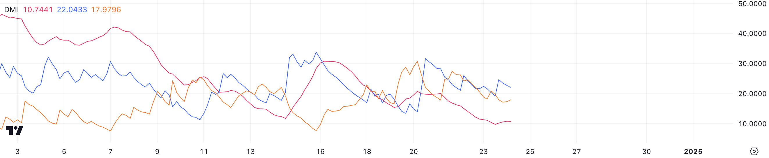 ADX, DMI-дің негізгі компоненті, трендтің күшін оның бағытын көрсетпей өлшейді. 25-тен жоғары мәндер күшті трендті көрсетеді, ал 20-дан төмен мәндер әлсіз немесе жоқ трендті көрсетеді. DMI сонымен қатар екі бағыттық сызықты қамтиды: оң бағыттық индикатор (D+, қазіргі уақытта 22) және теріс бағыттық индикатор (D-, қазіргі уақытта 17.97).