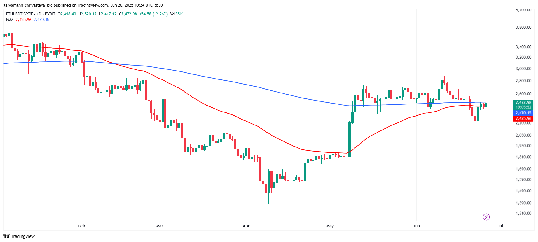 Соңғы төрт ай бойы сақталып келе жатқан ұзаққа созылған Өлім Крестінің аяқталуын білдіретін Алтын Крест, егер бұл сату белсенділігі жалғаса берсе, ұзақ уақытқа созылуы мүмкін. Нарық нәзік тепе-теңдікте қалып отыр, Өлім Кресті әлі де сақталып тұрғанда, Ethereum қалпына келуге тырысуда.