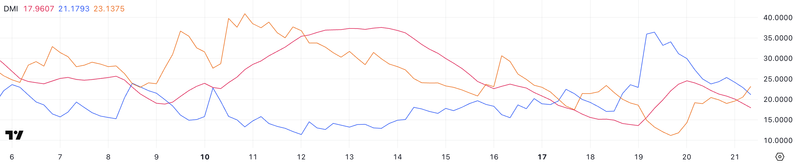 Ethereum-ның DMI графигі ADX көрсеткішінің кеше 24,5-тен 17,96-ға төмендегенін көрсетеді, тренд күшінің әлсірегенін көрсетеді.