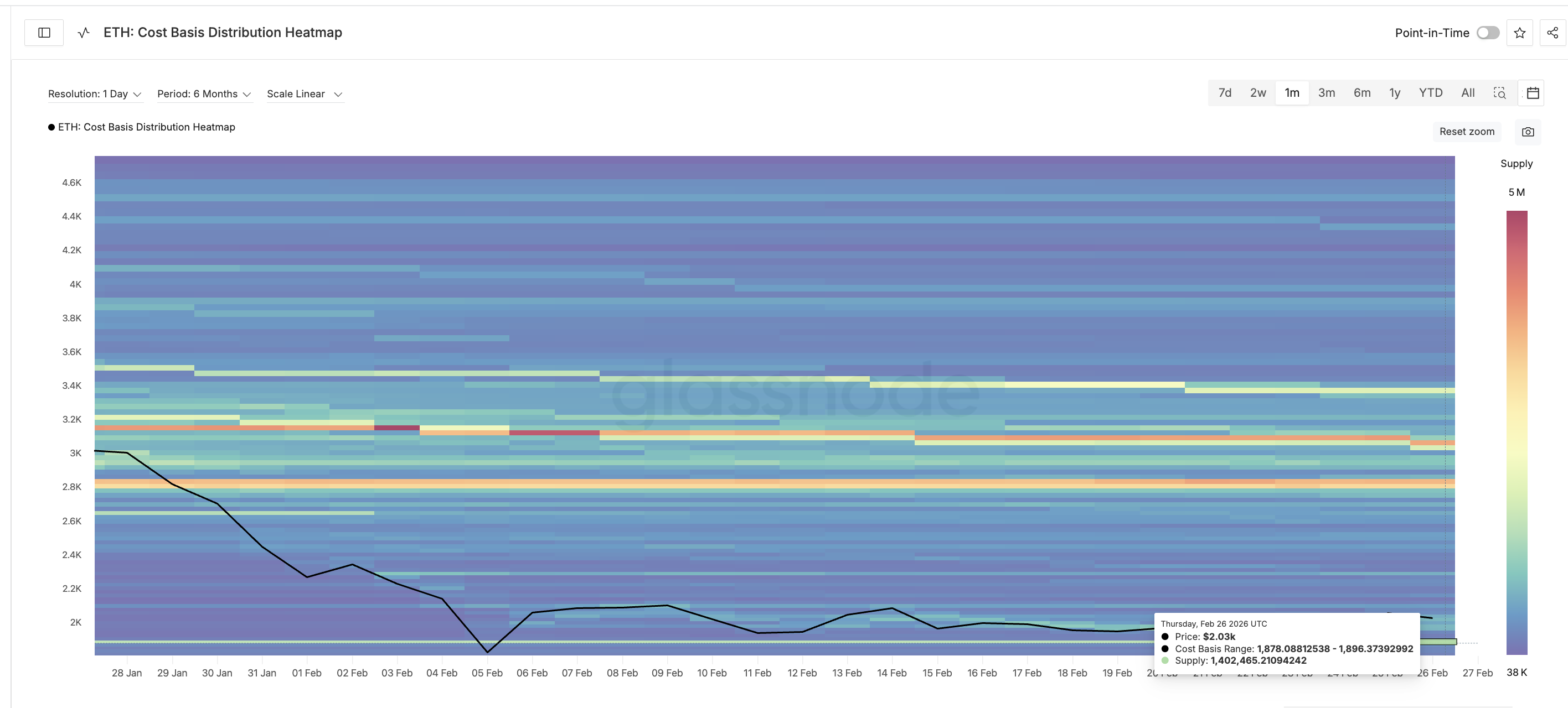 Ethereum бойынша өзіндік құн жылу картасы 1 870–1 890 доллар шамасындағы негізгі тірек кластерін көрсетеді. Осы диапазонда шамамен 1,40 млн ETH жиналған. Бұл деңгей маңызды, өйткені ол көптеген иелер үшін орташа сатып алу аймағы боп табылады.