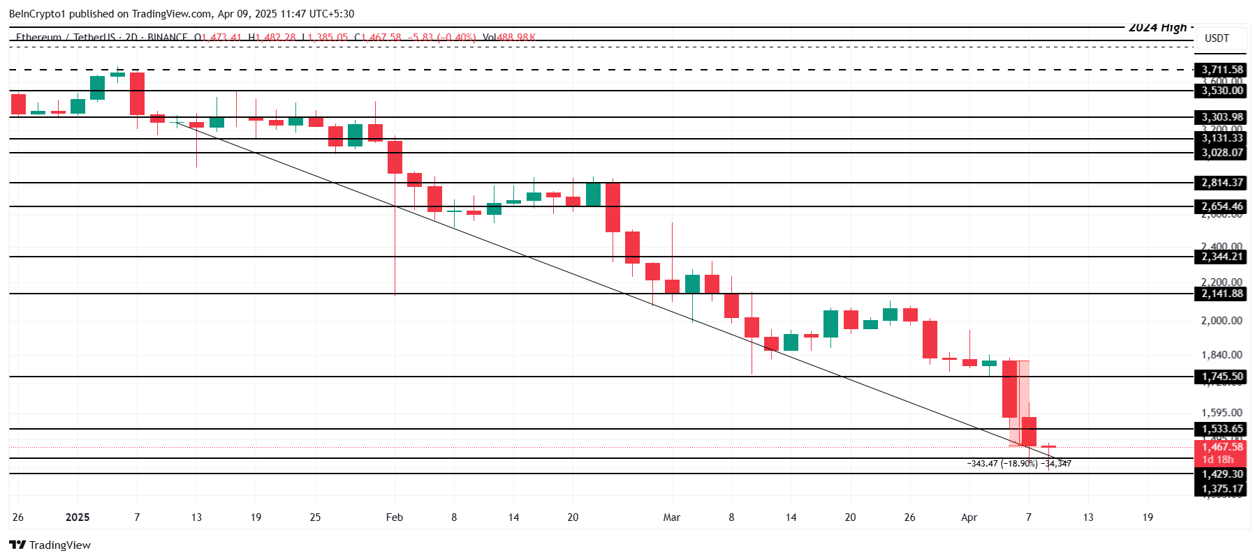 Ethereum бағасы соңғы 48 сағат ішінде шамамен 19%-ға төмендеп, жылдық минимум 1 375 долларға жетті. Жазу кезінде альткоин 1 467 доллардан саудалануда. Ол 1 533 доллар маңызды қолдауын жоғалтып, 1 500 доллардан төмен түсті. Залалдарға қарамастан, Ethereum-ның тарихи тұрақты көрсеткіштері мен жаңартылған инвесторлық қызығушылықты ескере отырып, қалпына келуі ықтимал.