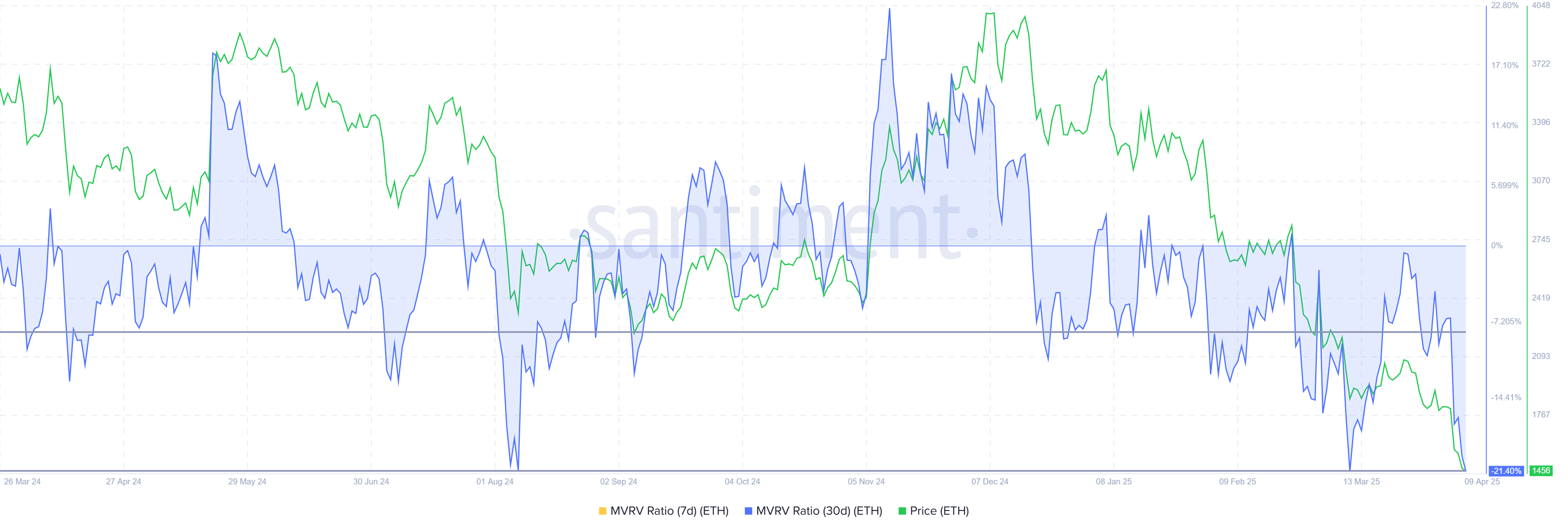 Нарықтық құнды жүзеге асырылған құнға қатысты өлшейтін MVRV коэффициенті қазір «мүмкіндік аймағында», -8%-дан -21%-ға дейінгі аралықта. Бұл диапазон Ethereum-ның бағаланбағанын көрсетеді, өйткені бағалар инвесторлар әдетте араласатын деңгейге дейін төмендеді. Тарихи тұрғыдан алғанда, мұндай жағдайлар баға үрдістерінің кері өзгеруіне әкелген.