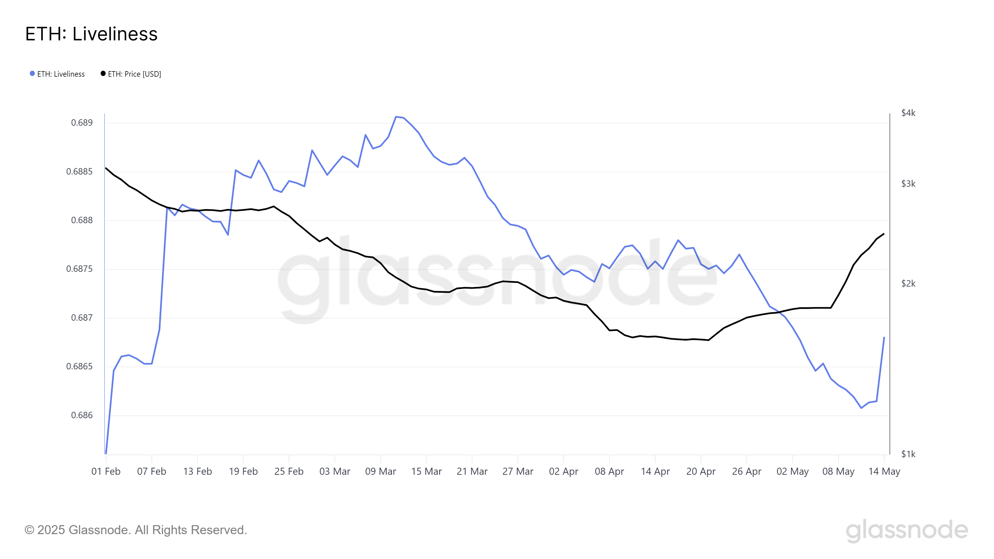 Ethereum үшін Liveliness метрикасы күрт өсуін көрсетіп, ұзақ мерзімді иелердің (LTHs) арасында сату белсенділігінің артқанын білдіреді. Бұл өсу үш айдағы алғашқы елеулі көтерілу болып табылады, бұл негізгі инвесторлардың ағымдағы баға деңгейінде пайда табатынын көрсетеді. LTHs активтің тірегі болып саналатындықтан, олардың сатуы Ethereum бағасына төмен қысым көрсетуі мүмкін.