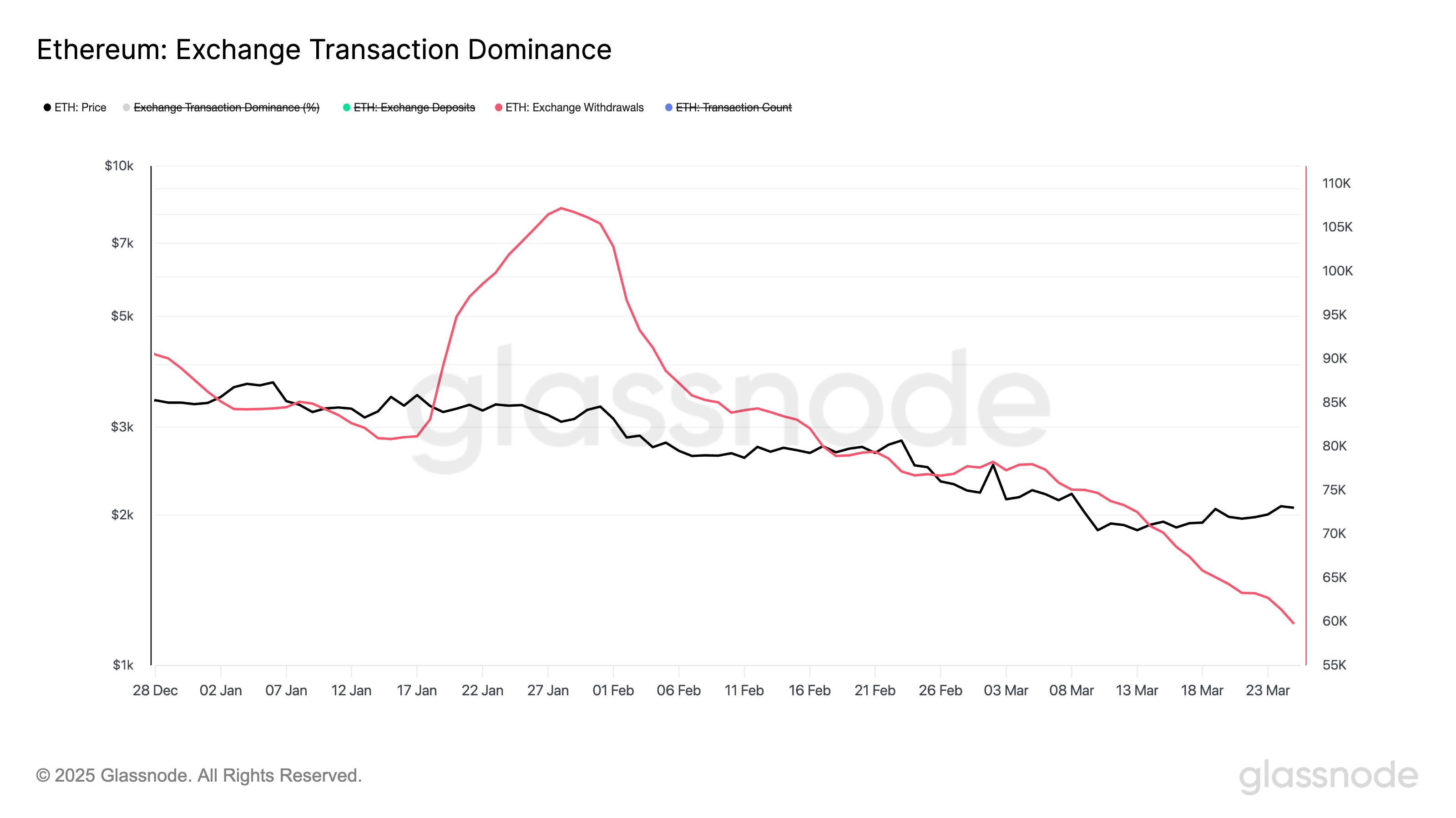 Ethereum-ның биржалық транзакция үстемдігін бағалау қаңтардың соңынан бері ETH алу көлемінің айтарлықтай төмендегенін көрсетеді. Glassnode мәліметтері бойынша, ETH-ның биржадан алу транзакциялары сейсенбі күні 59 755 монетаны құрап, 31 тамыздан бергі ең төменгі бір күндік көрсеткішке жетті.