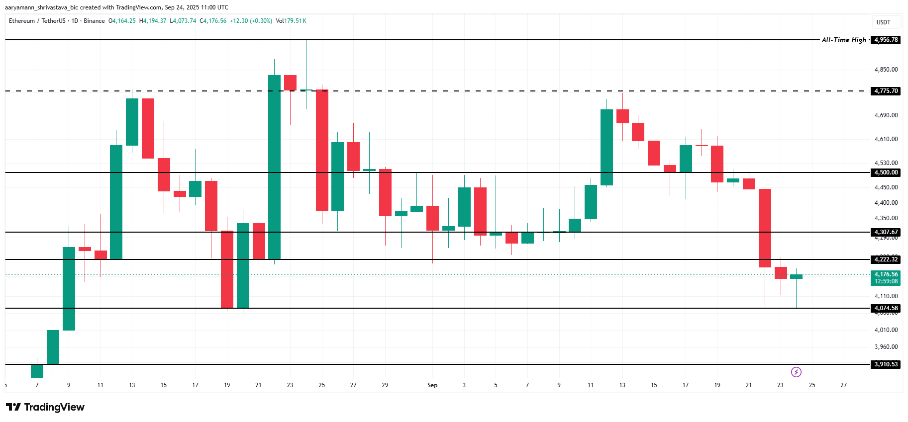 Ethereum-ның бағасы қазіргі уақытта 4 176 доллар, дағдарыстық 4 074 доллар қолдау аймағынан сәл жоғары тұр. Жақын кедергі 4 222 долларда, оны ETH бұзып өтуі керек, әрі қарай қалпына келтіруге тырысу үшін.