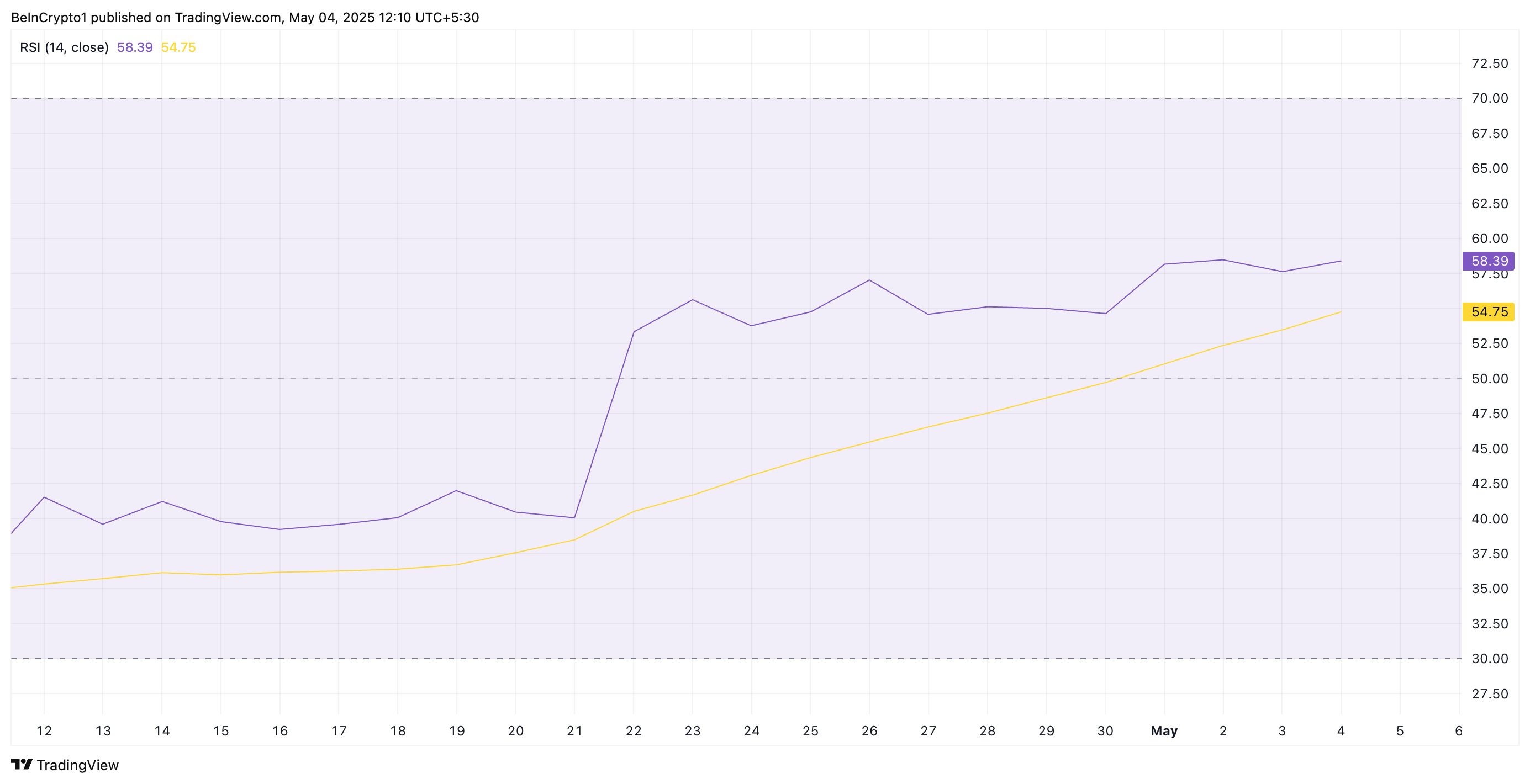 Сонымен қатар, альткоиннің Салыстырмалы күш индексі (RSI) жоғарылауды жалғастырып, бұл бұқа нарративін қолдайды. Жариялау кезінде ол 58,39 деңгейінде және өсуде.