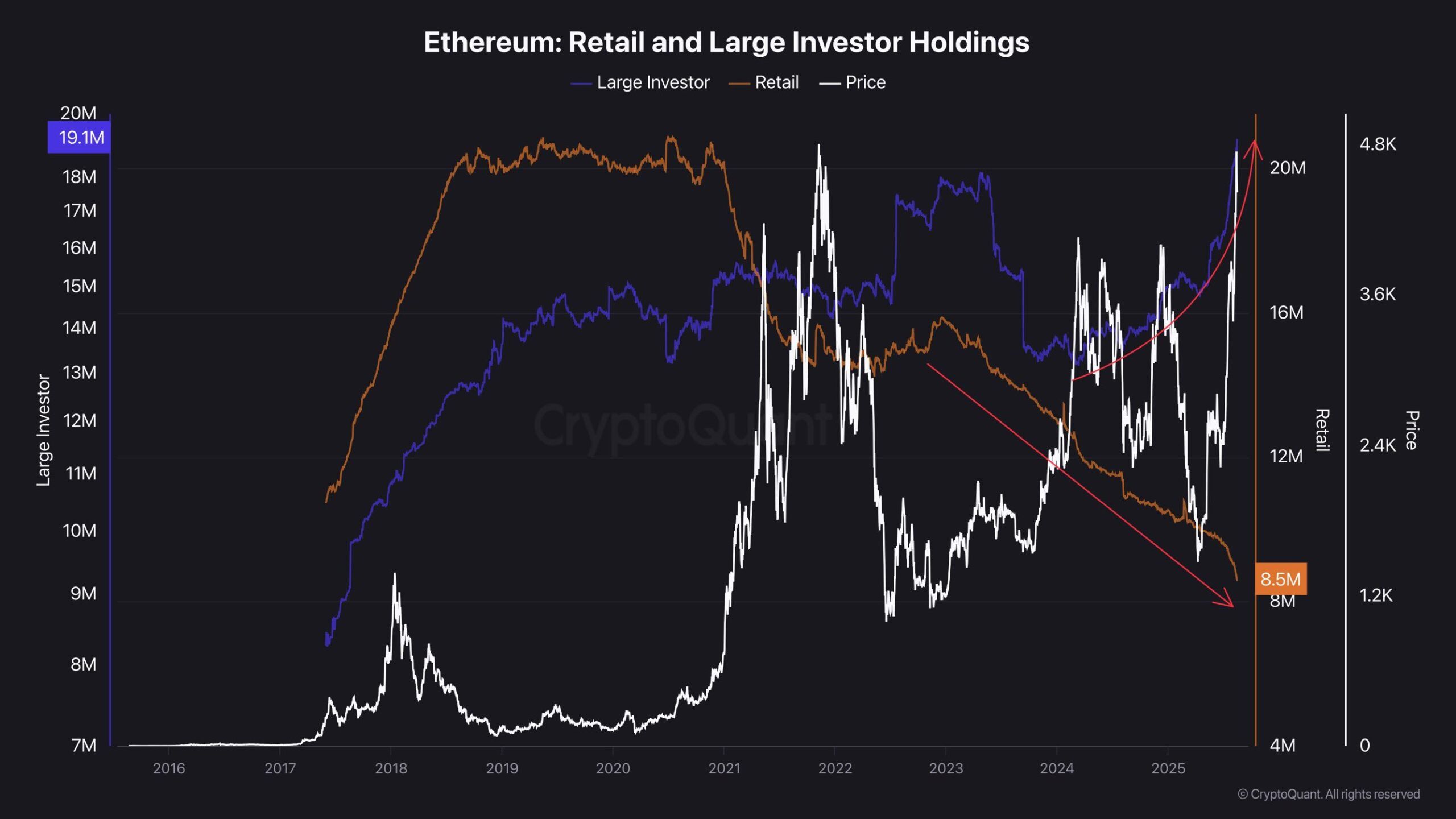 Нәтижесінде Ethereum иелерінің құрылымында айқын өзгеріс байқалады. CryptoQuant деректері ірі инвесторлар әмияндарының саны жаңа шыңдарға жетіп жатқанда, бөлшек сауда әмияндарының саны тұрақты түрде азайып жатқанын көрсетеді.