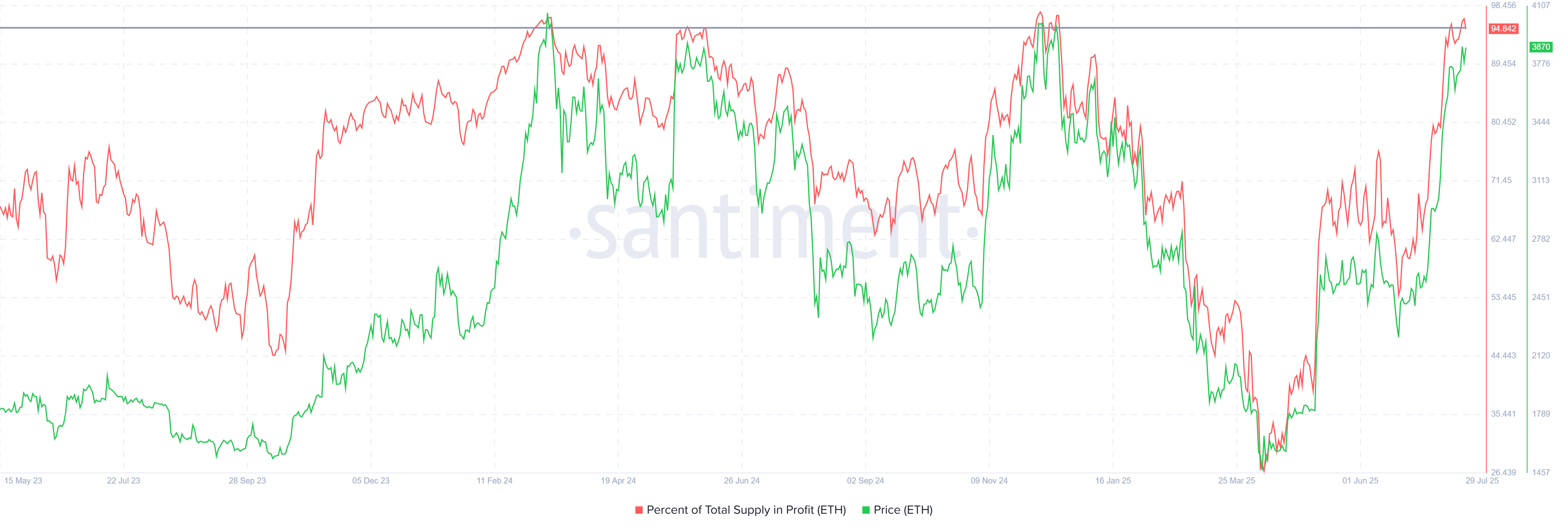Қазіргі уақытта Ethereum-ның жалпы ұсынысының 94%-ы пайдада. Тарихи тұрғыдан алғанда, пайдадағы ұсыныс 95%-дан асқанда, бұл нарықтың шыңын білдіреді. Бұл инвесторлар пайдасын қамтамасыз ете бастаған кезде бағаның түзетулерімен жалғасады. Нәтижесінде, Ethereum бағасы тренд жалғасса, кері шегініске ұшырауы мүмкін, бұл соңғы жетістіктерді кері қайтаруы ықтимал.