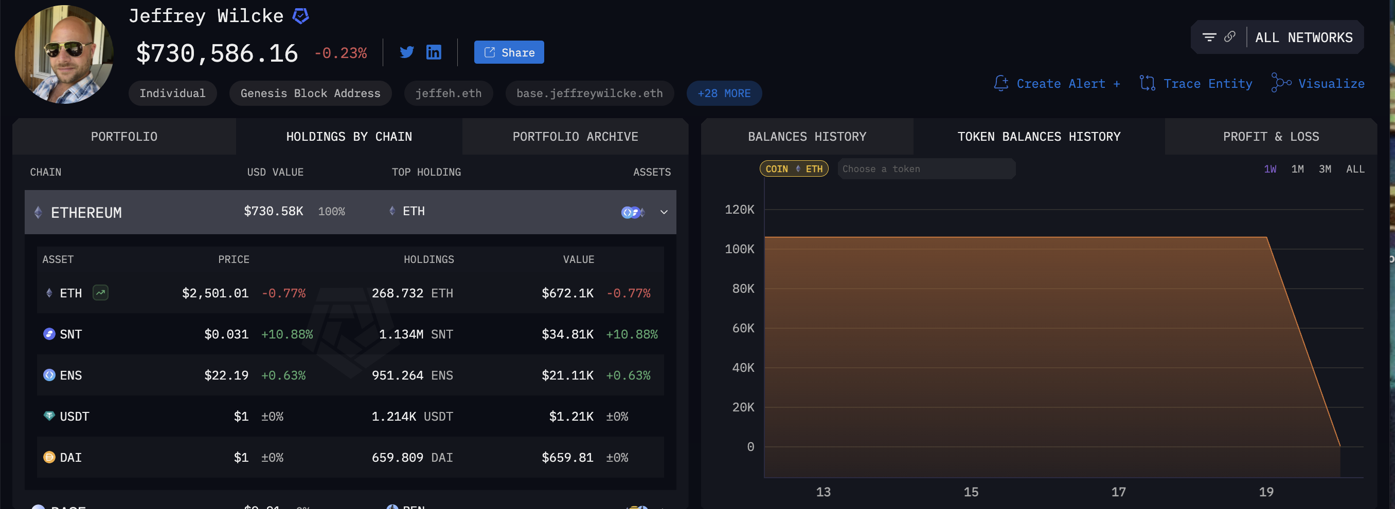 Бұл ықтимал ETH сатылымы алғаш рет Arkham Intelligence, блокчейн талдау платформасы арқылы байқалды. Arkham өзінің Ethereum активтерінің басым бөлігін бір үлкен транзакциямен аударған Уилкеге тиесілі болып көрінетін әмиянды тапты.
