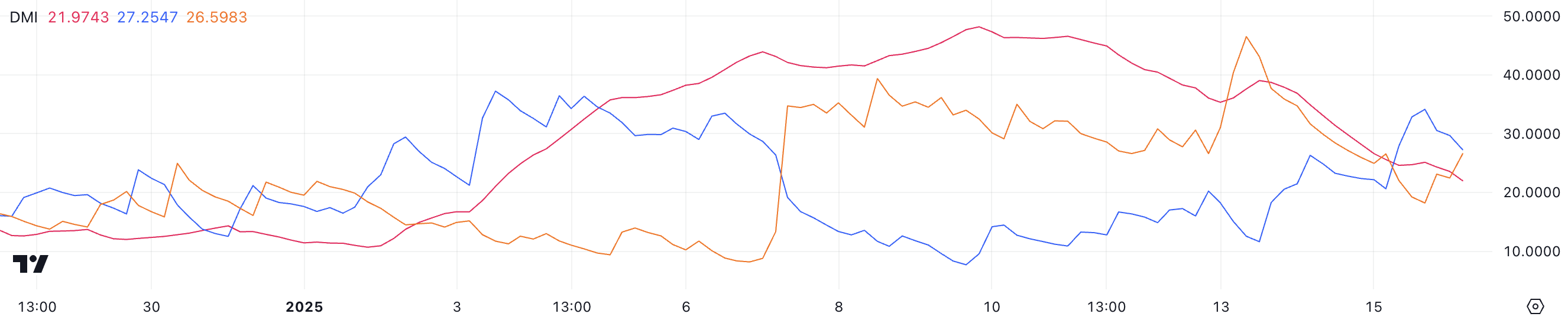 Ethereum DMI диаграммасы ADX қазір 21,9 деңгейінде екенін көрсетеді, үш күн бұрын 39-дан төмендеген, бұл тренд күшінің айтарлықтай төмендеуін көрсетеді.
