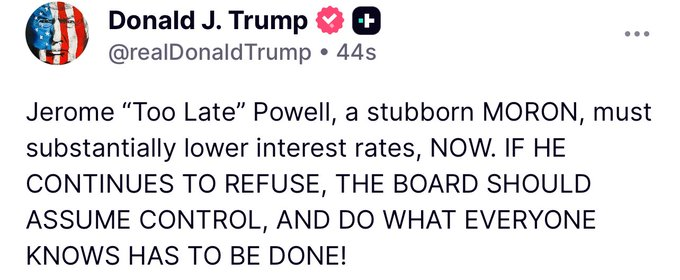 Бұл шешім ұзақ уақыт бойы төмен мөлшерлемелерді талап етіп келе жатқан президент Трамптың тағы бір наразылығын тудырды. Ол әлеуметтік желілерді пайдаланып, ФРЖ басшысын “тым кеш” деп атап, оның шешімі миллиардтаған доллар тұратынын айтты.