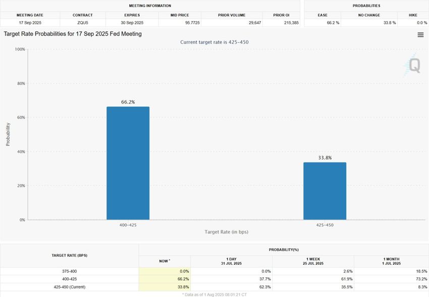 Алайда, ай сайынғы жұмыспен қамту туралы нашар есеп көңіл-күйді өзгертті. Нарық қатысушылары енді алдағы ФРЖ отырысында мөлшерлемені төмендету ықтималдығы 66%-дан жоғары деп санайды.