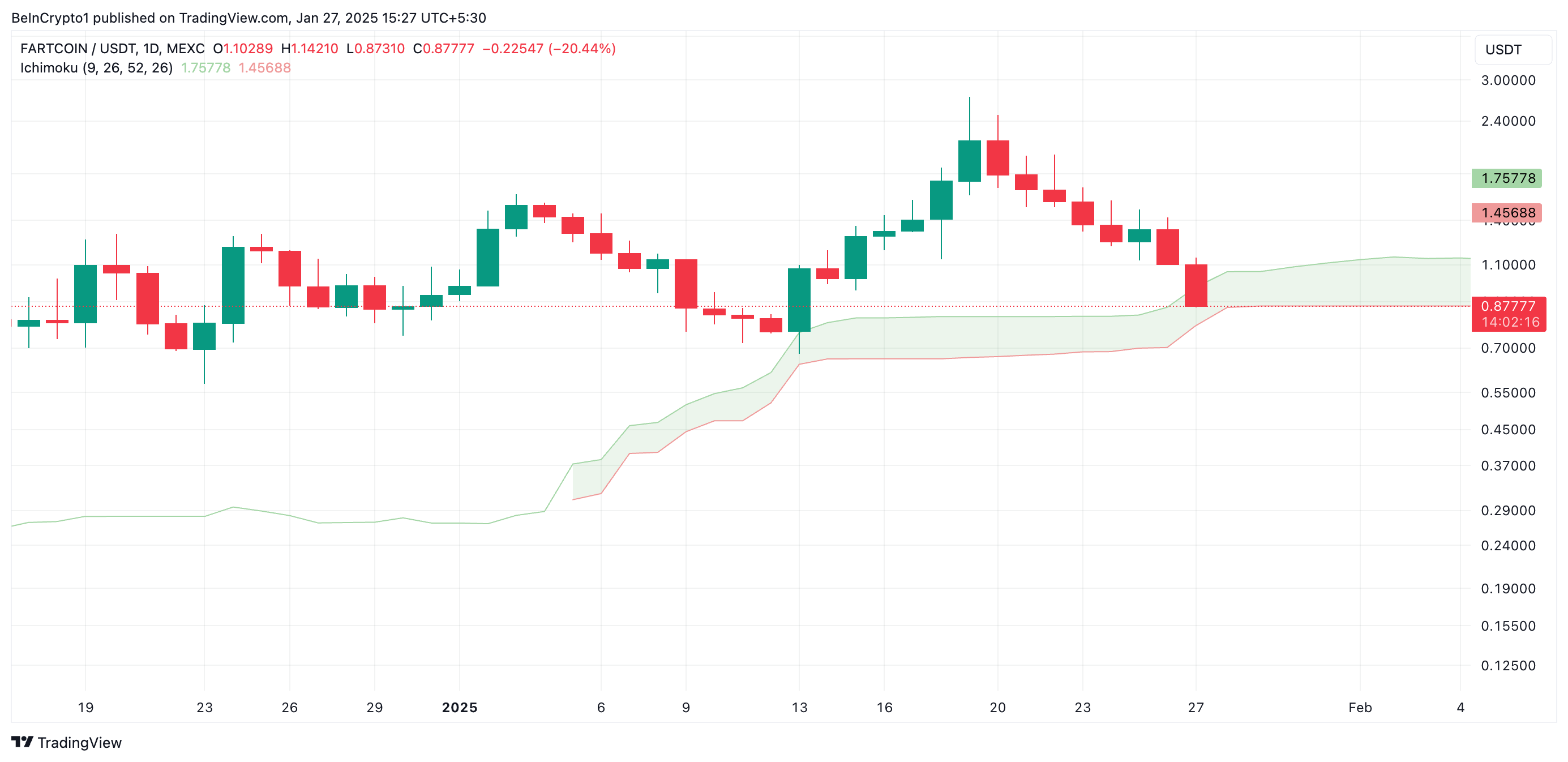 Solana негізіндегі көптеген мемкоиндардың құнын жаңа баға шыңдарына жеткізген мемкоин маниясының арқасында, FARTCOIN жаңа тарихи максимумға 19 қаңтарда 2,74 долларға жетті. Алайда, бұл ажиотаж бәсеңдеген сайын, FARTCOIN-ға деген сұраныс та азайды. Содан бері оның құны 66%-ға төмендеп, баспасөз уақытында токен 0,88 доллармен саудалануда.