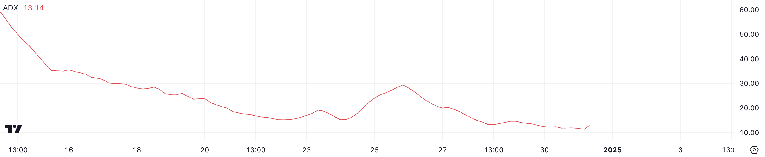 FARTCOIN ADX қазіргі уақытта 13.1 деңгейінде, бұл токеннің соңғы 24 сағат ішінде 30%-дан астам өсуіне қарамастан әлсіз тренд күшін көрсетеді.
