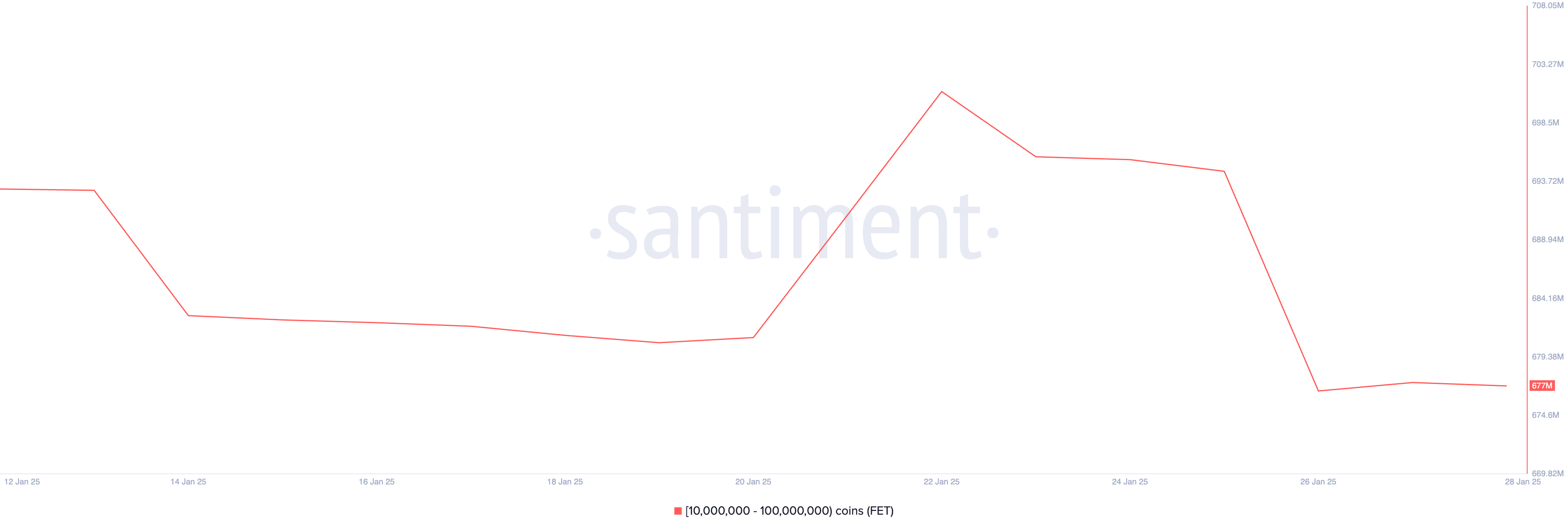 Santiment мәліметтері бойынша, 10 000 000 және 100 000 000 FET аралығында ұстайтын киттер жеті күннен аз уақыт ішінде 25 млн доллардан астам токендерді сатты, бұл FET құнын осы кезеңде 7%-ға төмендетті.