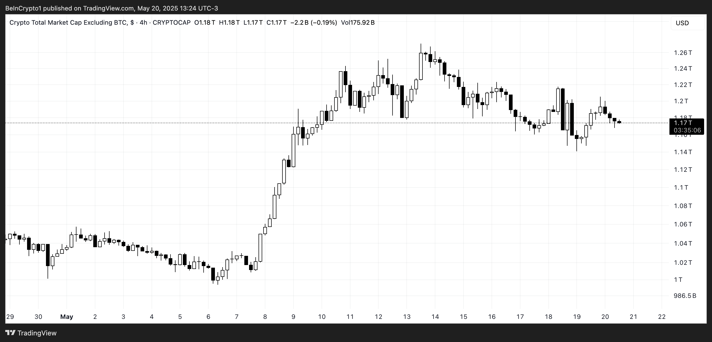 Bitcoin-ды қоспағанда, жалпы крипто нарықтық капитализациясы қазіргі уақытта 1,17 трлн долларды құрайды, 7 мамырда 1,01 трлн доллардан жоғары, бірақ 13 мамырда 1,26 трлн доллардан күрт төмендеді.