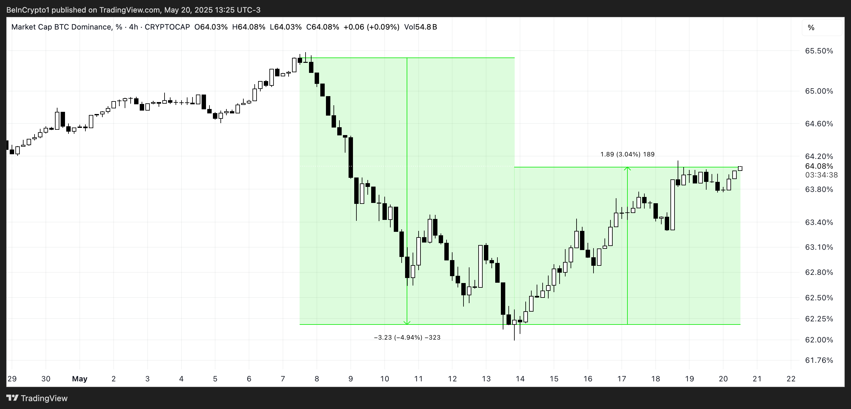 Бұл оптимизм нарық құрылымымен қысқаша сәйкес келді — 7 мамыр мен 13 мамыр аралығында Bitcoin үстемдігі 65,5%-дан 62,2%-дан төменге дейін күрт төмендеді, бұл шамамен 5%-ға төмендеу альткоин маусымы басталды деген болжамды күшейтті.