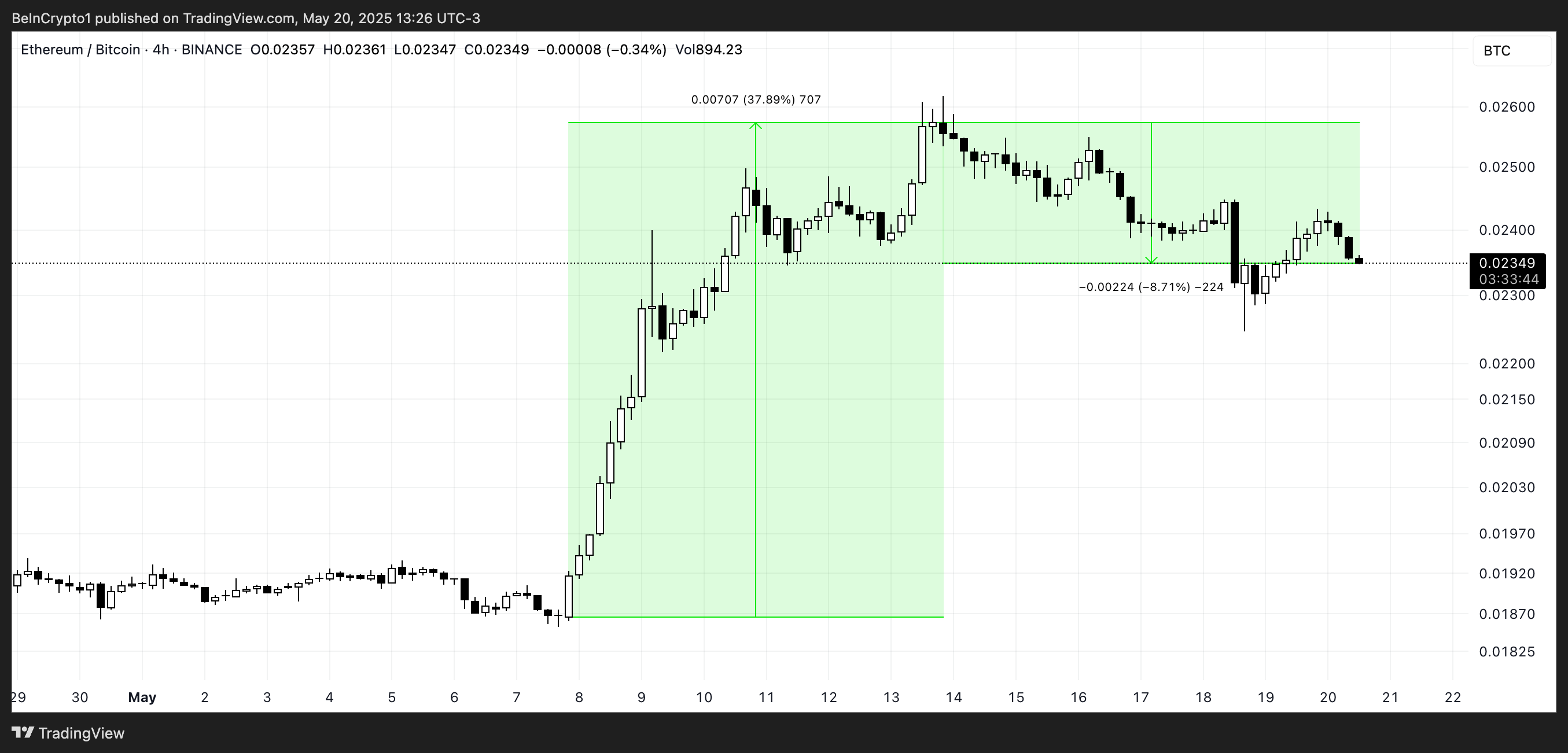 Бірақ келесі аптада — 14 мамырдан 20 мамырға дейін — сол қатынас 8,7%-ға төмендеп, ETH үшін салыстырмалы күштің әлсірегенін және альткоин маусымы үміттерінің төмендегенін көрсетті.