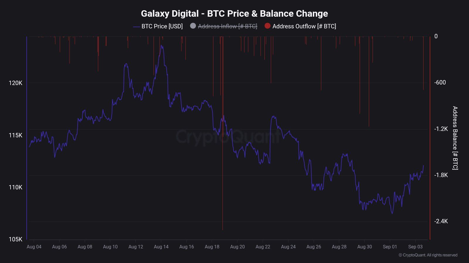 Бұл алаңдаушылық орынды көрінеді. Графиктер Galaxy Digital әмияндары өткен айда 2 400 BTC-ден 600 BTC-ге дейінгі бірнеше шығыстарды тұрақты түрде тіркегенін көрсетеді. Сонымен қатар, тамыз айында Bitcoin бағасы төмендеді.
