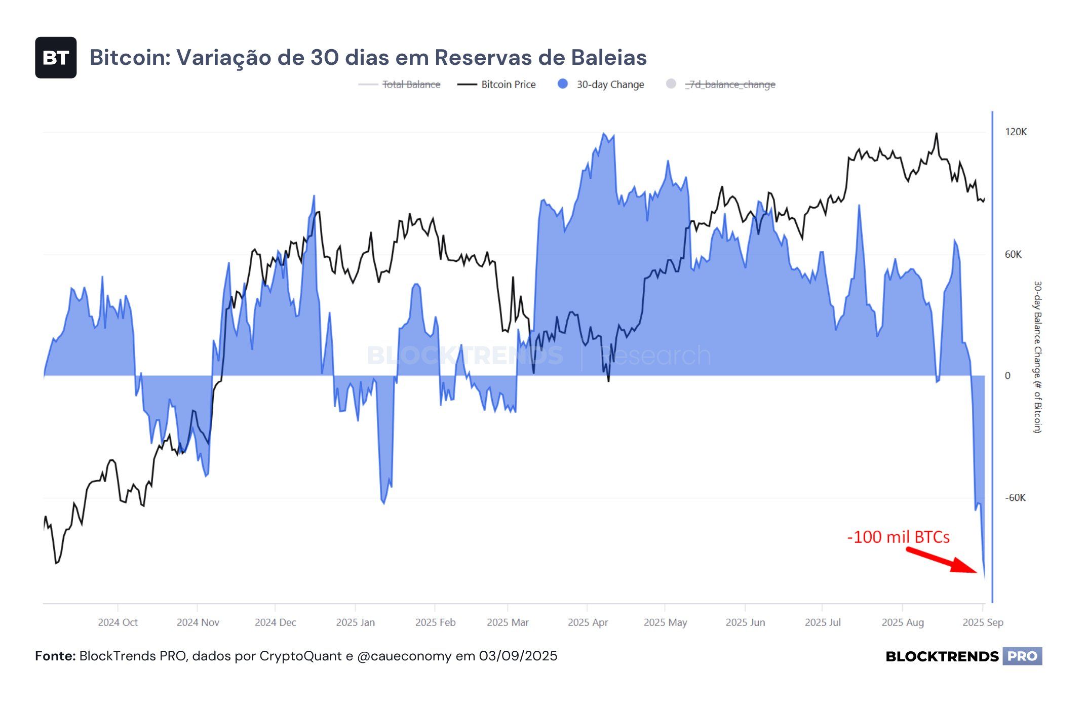 Cauê Oliveira Bitcoin киттері арасында кеңірек трендті байқады, олардың соңғы 30 күнде 100 000-нан астам BTC сатқанын атап өтті. Blocktrends деректері бұл 2022 жылдан бергі ең үлкен айлық сату толқыны екенін көрсетеді.