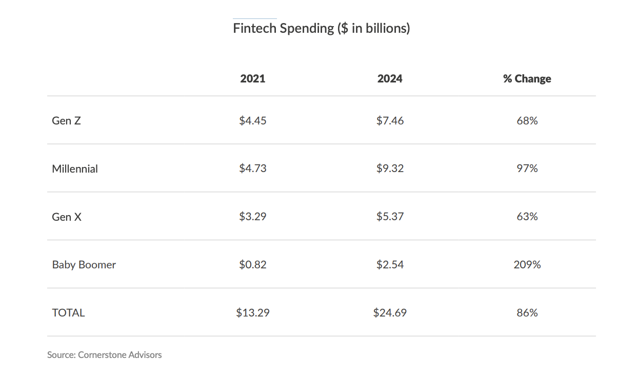 Cornerstone Advisors компаниясының жақында жасаған есебі барлық ұрпақтар арасында финтех шығындарының айтарлықтай өскенін көрсетеді. 2021 жылдан 2024 жылға дейін Gen Z, Millennials, Gen X және Baby Boomers арасында финтех шығындары 86%-ға, 13,29 млрд доллардан 24,69 млрд долларға дейін өсті.