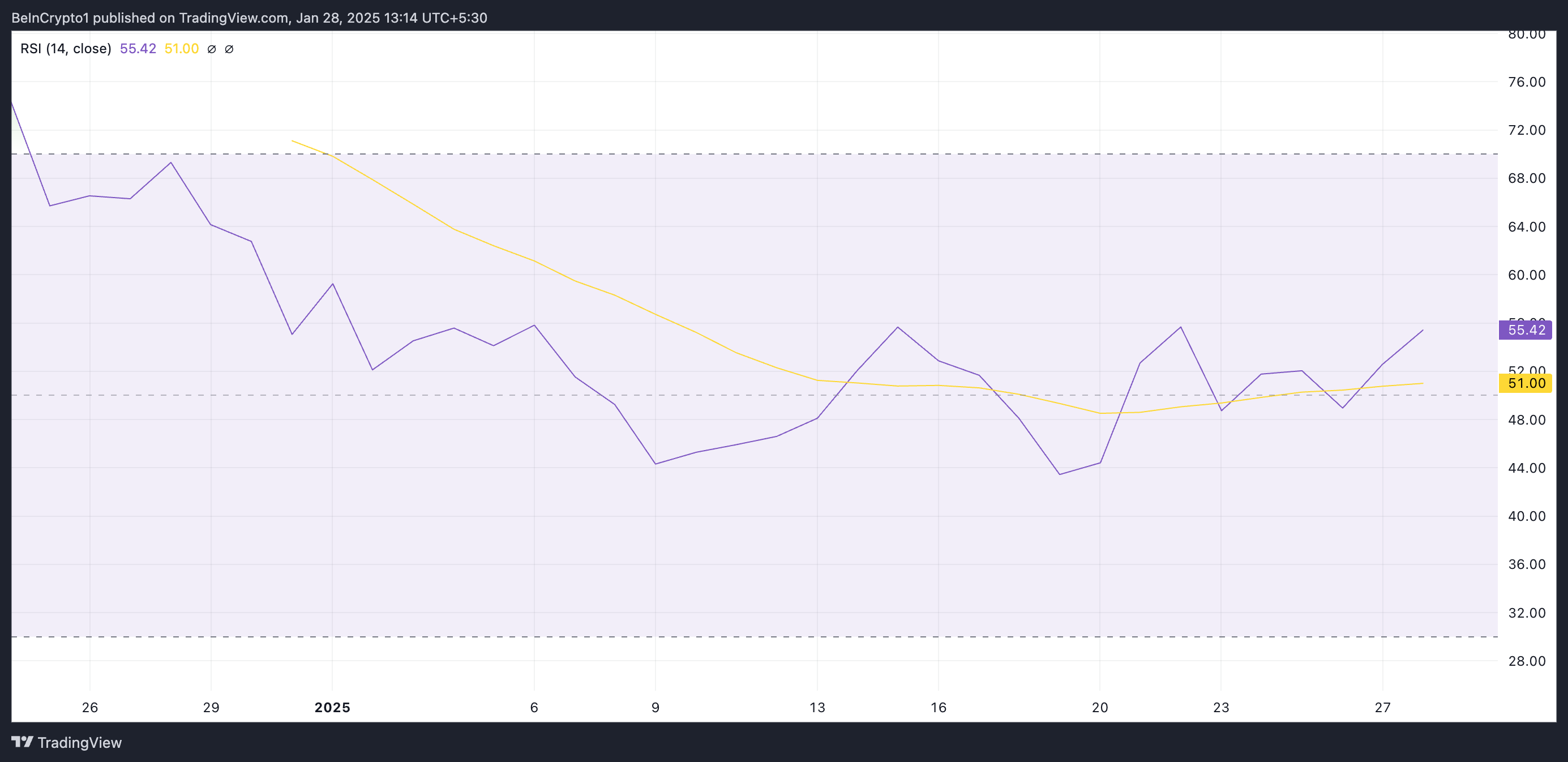 RSI индикаторы активтің артық сатылған және артық сатып алынған нарықтық жағдайларын өлшейді. Ол 0 мен 100 аралығында өзгереді, 70-тен жоғары мәндер активтің артық сатып алынғанын және түзетуге ұшырауы мүмкін екенін көрсетеді. Керісінше, 30-дан төмен мәндер оның артық сатылғанын және қалпына келуге дайын екенін көрсетеді.