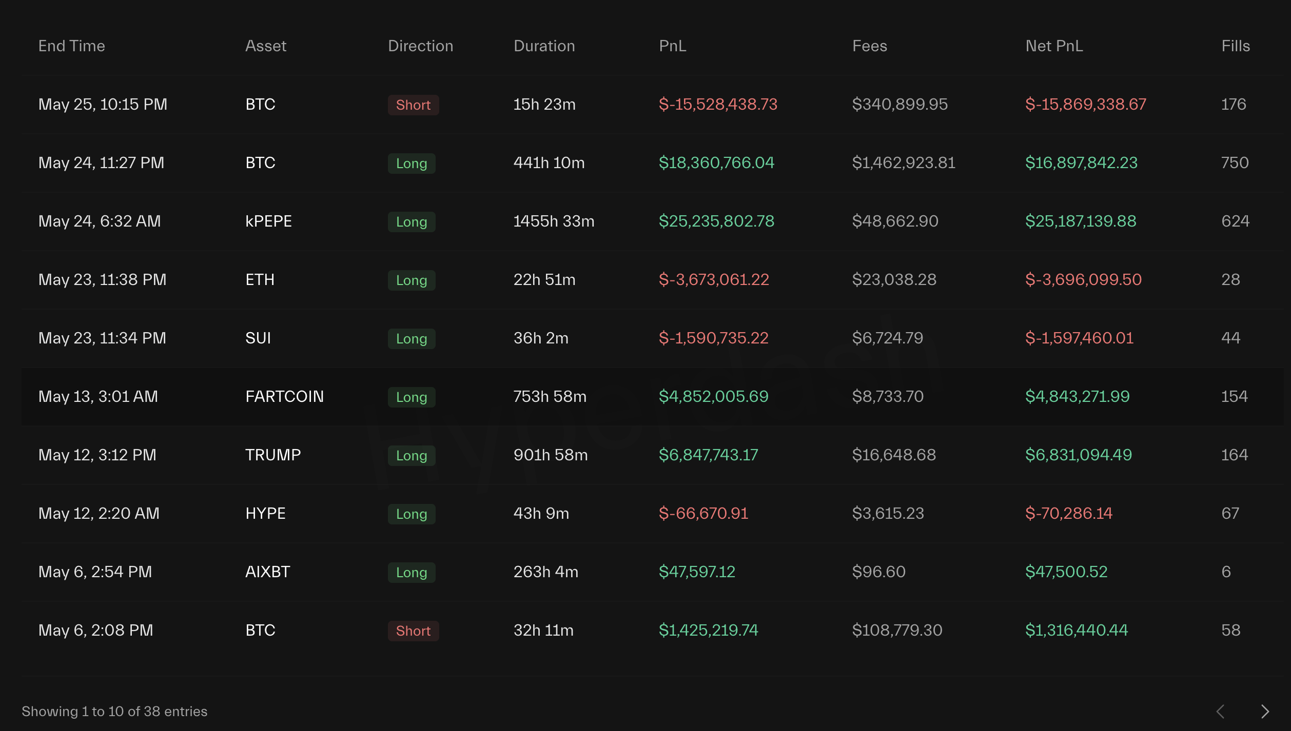 «Мамыр айынан бастап Hyperliquid 55,4 млн доллар транзакциялық комиссия жинады, ал комиссиялар мен протокол кірісі 2025 жылдан бері 21 мамырда шыңына жетіп, бір күнде 4,65 млн доллар комиссияға жетті. Сол күні Джеймс пен Insider Bro қарама-қарсы позициялар ашты, Джеймстің позициясы алғаш рет 1,2 млрд долларға жетті», – деп X қолданушысы ai_9684xtpa бөлісті.