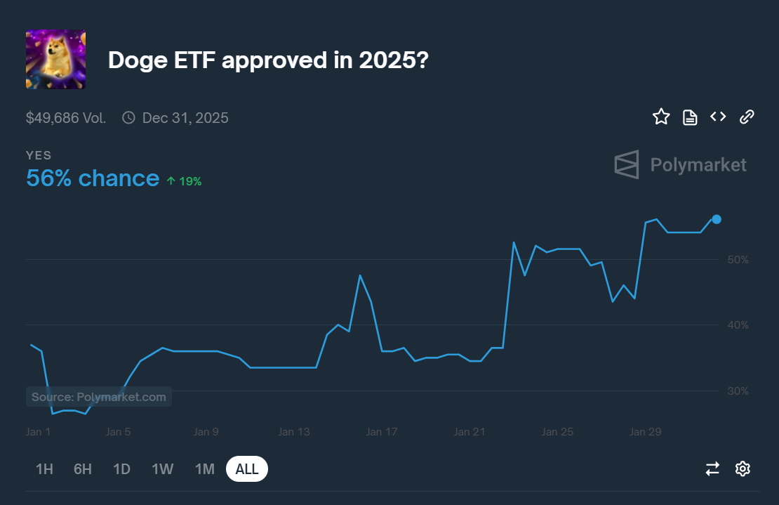 Болжам нарықтары осы өзгерістерге қатты әсер етті. Polymarket-те ETF мақұлдау мүмкіндігі 56%-ке дейін өсті. Бұл крипто инвестициялық өнімдердің реттеуші қабылдануына деген сенімнің артуын көрсетеді.
