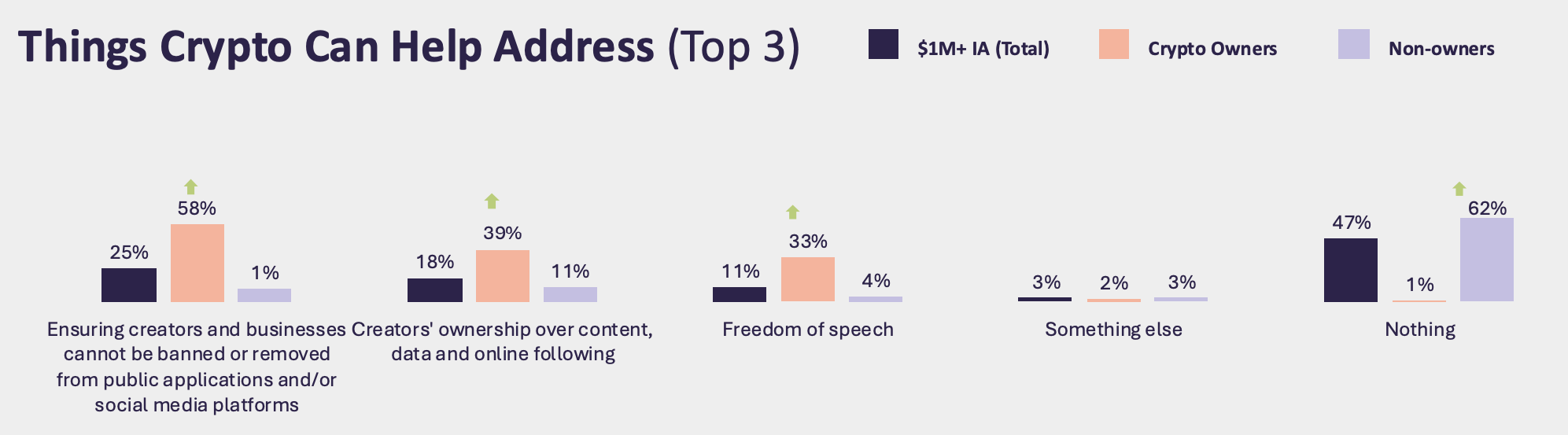 Алайда, бұл бай респонденттердің жартысына жуығы криптовалютаның инвестициядан тыс қолдану жағдайлары жоқ деп санайды. Бұл қауымдастықтағы өсіп келе жатқан бөлінуді көрсетеді, өйткені кейбіреулер технологиялық инновациялардың жоғалуынан қорқады.
