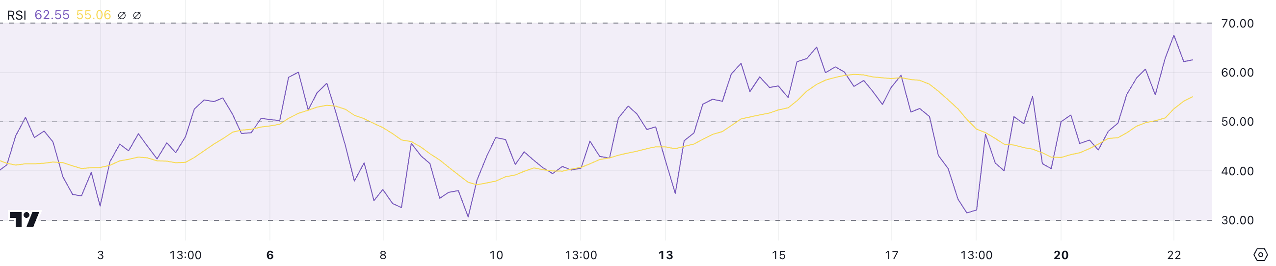 RSI 0-ден 100-ге дейінгі диапазонда болатын импульс осцилляторы, активтің артық сатып алынған немесе артық сатылғанын бағалау үшін қолданылады. 70-тен жоғары мәндер артық сатып алу жағдайларын көрсетеді, ал 30-дан төмен мәндер артық сату жағдайын білдіреді. HYPE RSI 62,5 болғандықтан, бұл бұқа көңіл-күйінің қалыптасып жатқанын көрсетеді, бірақ баға әлі де күрт түзету қаупінде емес.