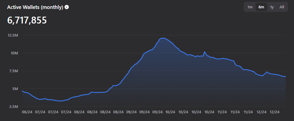 Бұл TON-ның тізбектегі белсенділігінде де көрінеді. Деректер көрсеткендей, ай сайынғы белсенді әмияндардың саны қазан айынан бері шамамен 50%-ға төмендеді.