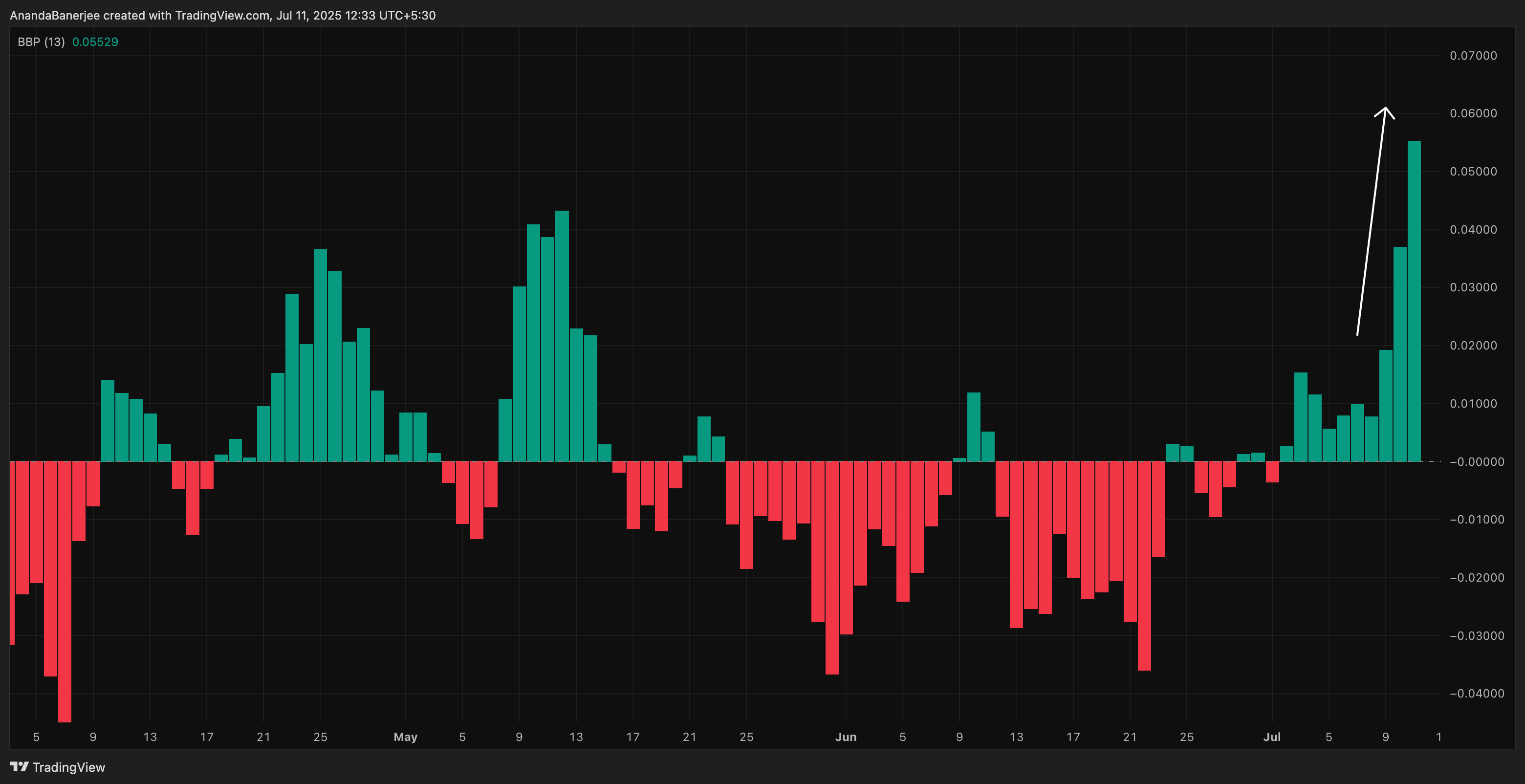 Он-чейн метрикалары, дегенмен, неғұрлым күрделі оқиғаны баяндайды. Сатып алушылардың сатушыларға қарағанда күшін өлшейтін Elder-Ray Bull Power Index төрт күн қатарынан өсті. Бұл соңғы шамдарда көрінетін фитильдерге (пайдасын алып жатқан сатушылар) қарамастан, бұқалық сенімнің әлі де бар екенін көрсетеді.