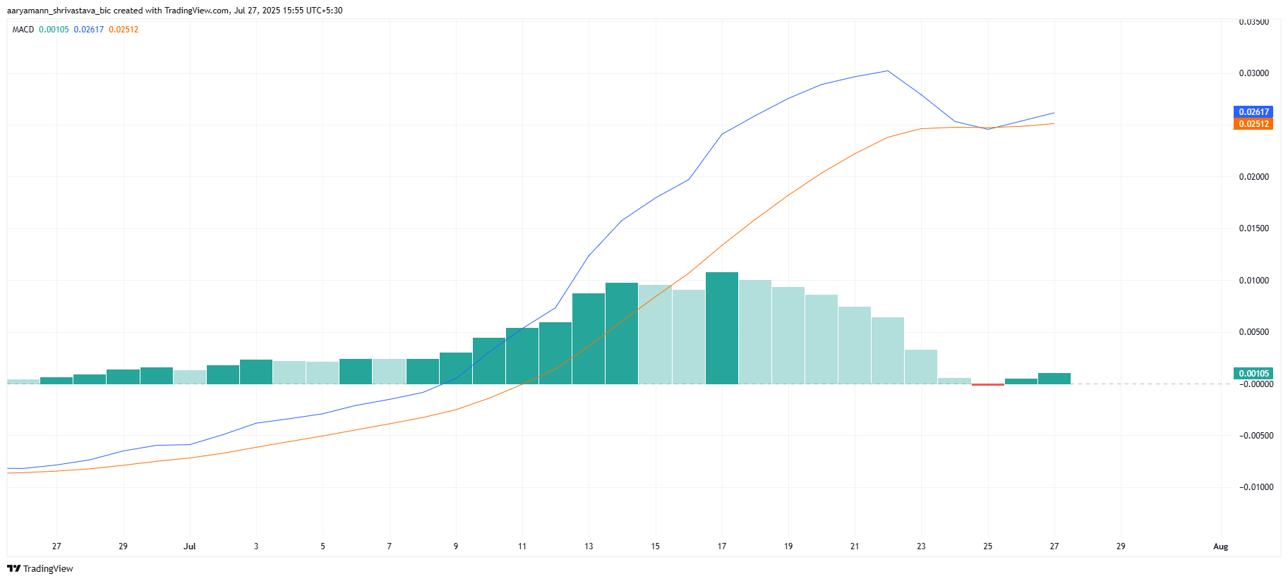 HBAR үшін MACD индикаторы бұқа импульсінің күшейіп келе жатқанын көрсетеді. Осы аптада MACD бұқа кроссоверін тіркеп, нарықта оң күштердің бар екенін көрсетті.