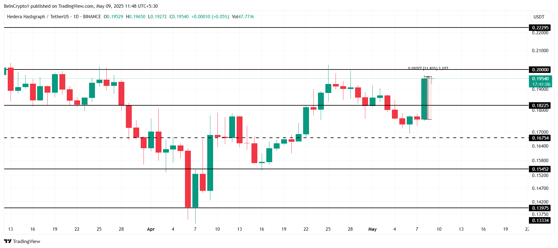 HBAR өткен айда күшті жоғары қозғалыс көрсетті, жақында 0,19 долларға жетіп, 0,20 доллар дағдарыстық қарсылық деңгейіне жақындады.