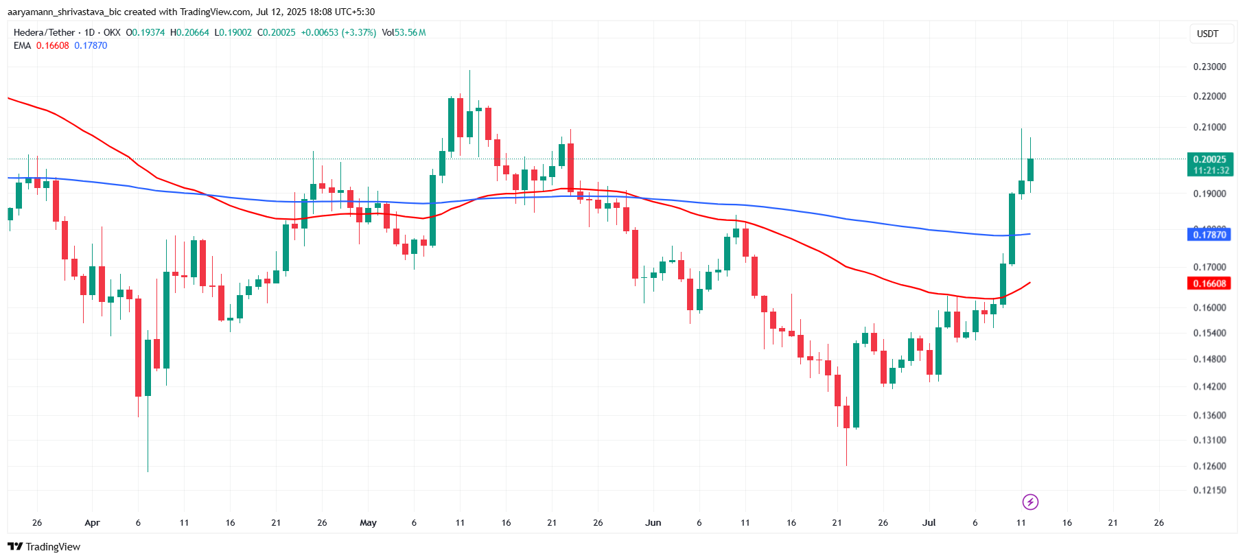 HBAR 0,200 долларда саудаланып, өткен аптада 30%-ға өсті. Бұл альткоиннің осы бағаны қолдау ретінде қайтарып алғанына бір жарым айдан астам уақыт өткенін білдіреді. Соңғы ралли HBAR-ды дағдарыстық 0,205 доллар қарсылық деңгейіне жақындатты.