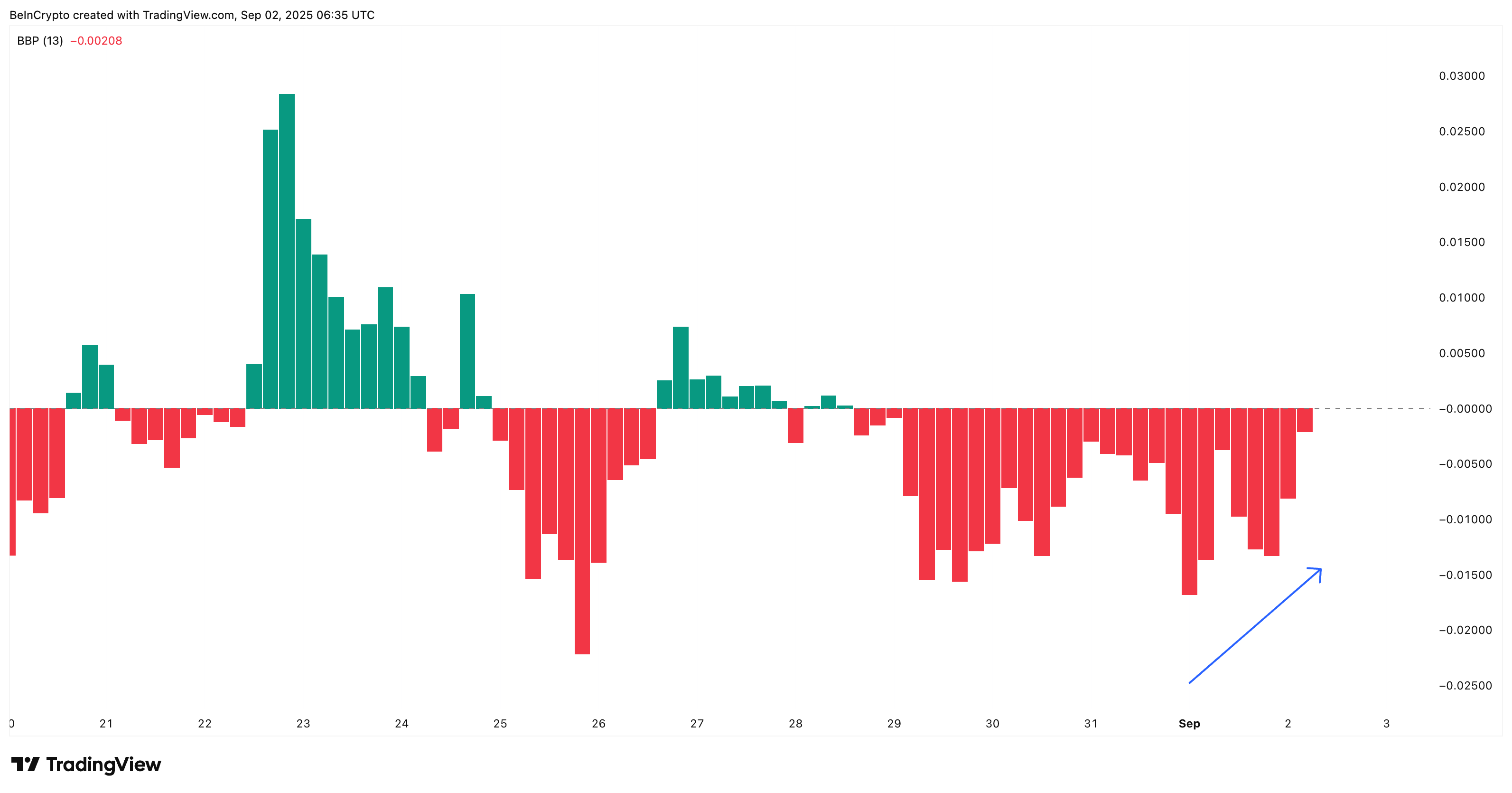 Сонымен қатар, сатып алушылар мен сатушылардың күшін өлшейтін Bull–Bear Power (BBP) 1 қыркүйектен бастап төмендеуде. Бұл аюлардың үстемдігі әлсіреп жатқанын, ал төмен бағамен сатып алу жалғасып жатқанын білдіреді.