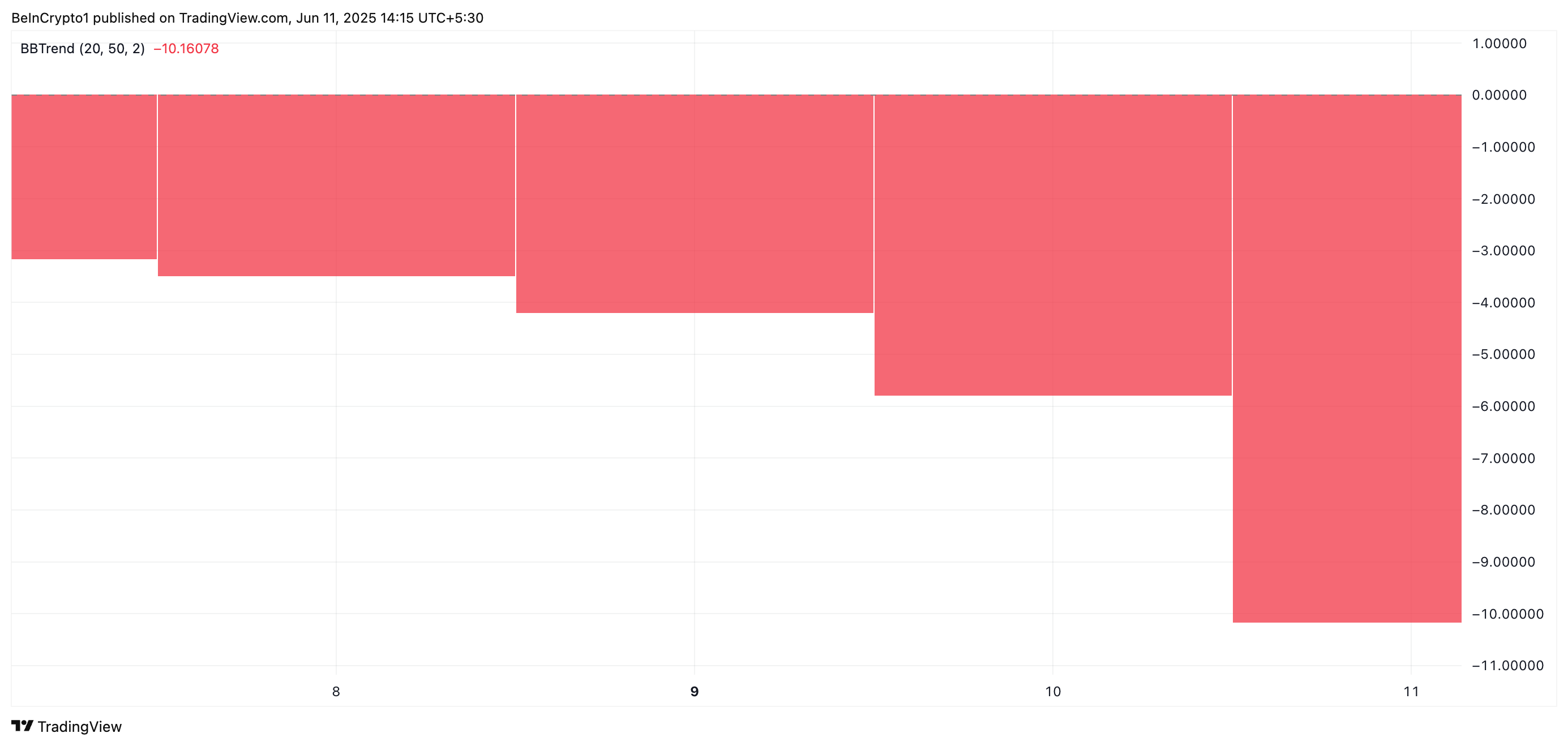 Сонымен қатар, альткоинның BBTrend индикаторының көрсеткіштері осы аюлы көзқарасты қолдайды. Бір күндік графикте байқалған индикатор қазіргі уақытта -10,16 деңгейінде тұр, әрбір сауда сессиясымен өлшемі ұлғайып келе жатқан қызыл гистограмма жолақтарын көрсетуде.