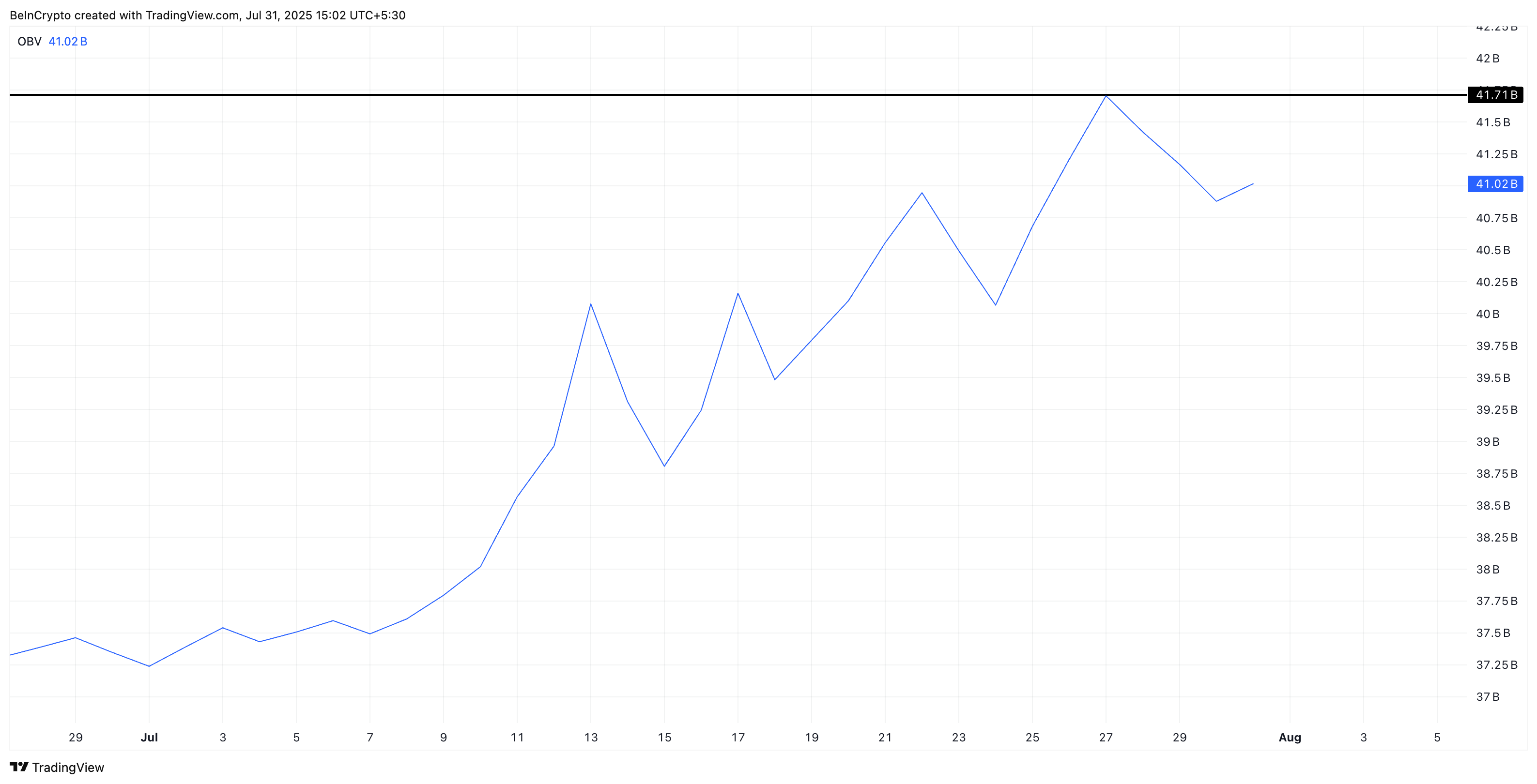 Сонымен қатар, On-Balance Volume (OBV) жоғарылауды жалғастыруда, бұл сатып алу белсенділігінің жалпы сатудан асып түсетінін растайды. OBV жоғары шыңдар жасағанымен, тамыз айында HBAR бағасының импульсін қолдау үшін 41,71 млрд белгісінен жоғары болуы қажет.