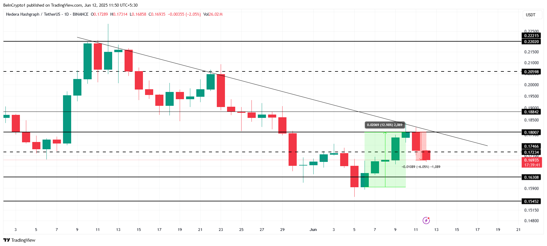 HBAR жақында аптаның басында қол жеткізген табыстарын жойып, құлдырауға ұшырады, қазіргі уақытта бағасы 0,169 долларға тең.