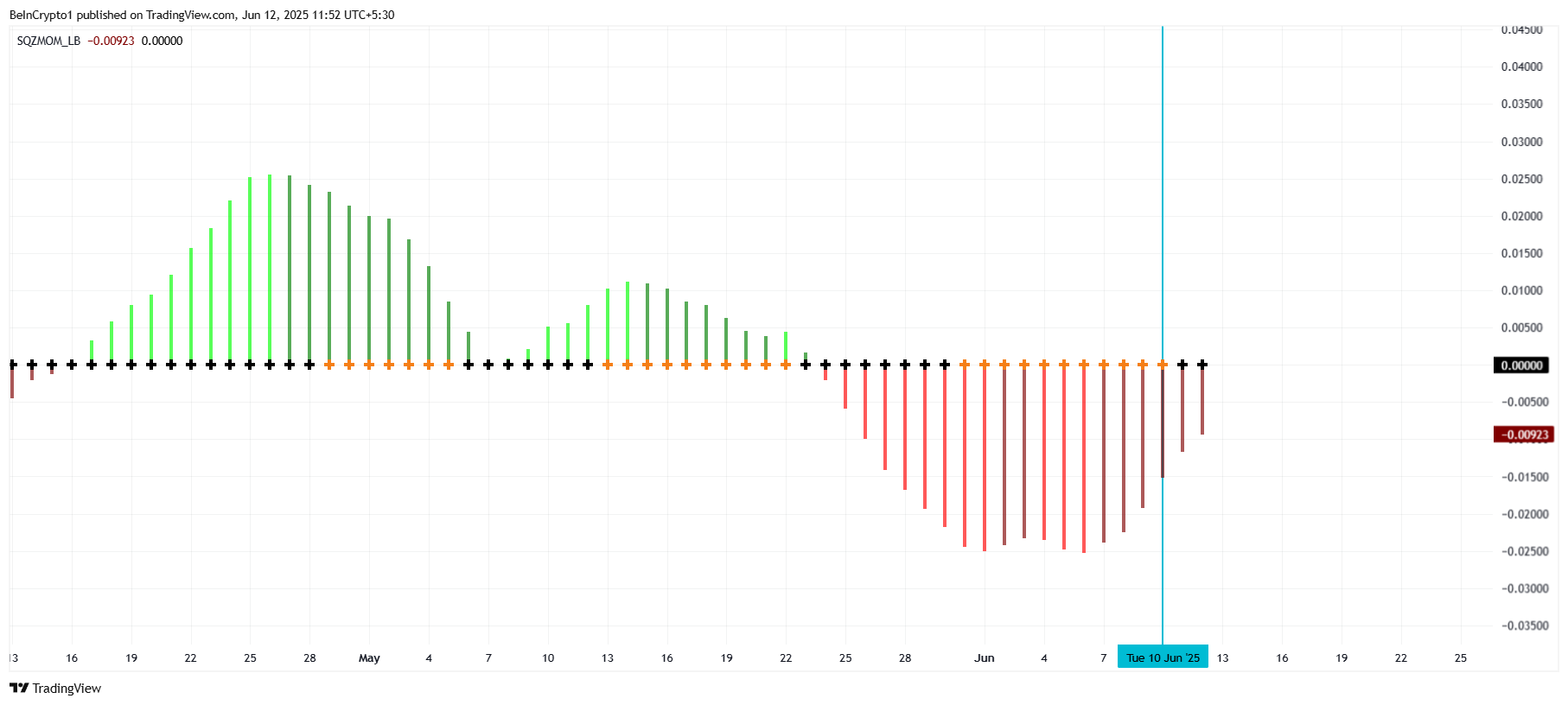 Squeeze Momentum Indicator (SMI) соңғы 48 сағат ішінде сығылуды (қара нүктелер) қалыптастырып, HBAR үшін жақын арада құбылмалылықтың жарылысын көрсетуі мүмкін. SMI нарық ауысуларын бағалауға көмектесіп, сығылу босатылған кезде айтарлықтай баға қозғалысы болуы мүмкін екенін көрсетеді. Нарықтағы сығылу көбінесе импульске байланысты жоғары немесе төмен күрт қозғалысқа әкеледі.