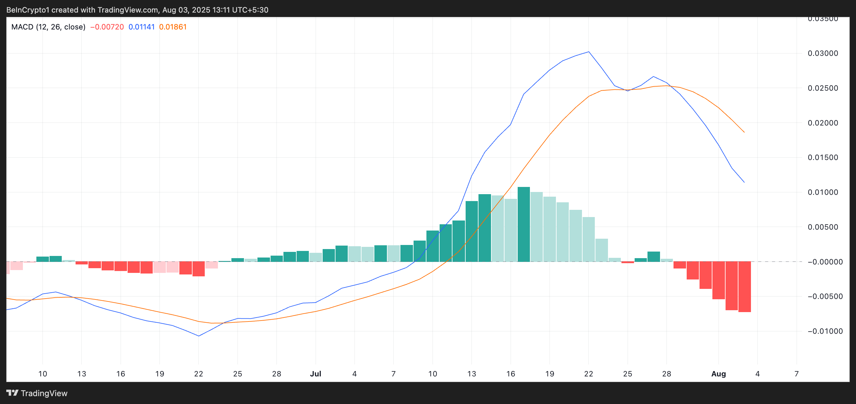 HBAR-мен болғандай, MACD сызығы сигнал сызығынан төмен орналасқанда, бұл сатып алу қысымының төмендеуін және сату жағының күшеюін білдіреді. Бұл қысқа мерзімде төмендеу жалғасуының ықтималдығын одан әрі қолдайды.
