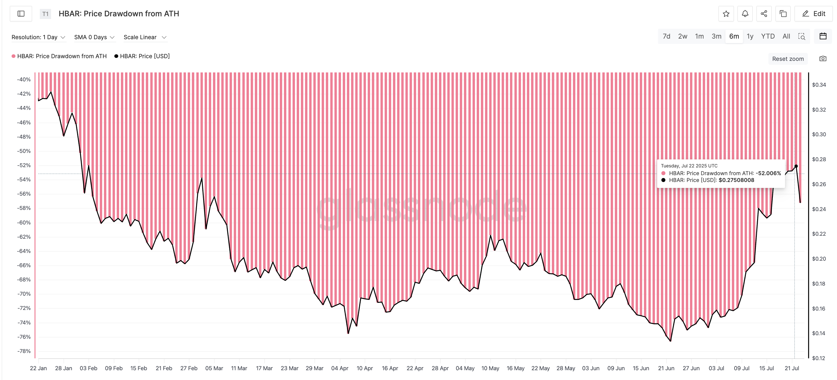 22 шілдеге жылдам алға жылжысаңыз, төмендеу 52%-ды құрады, HBAR $0,27 шамасында саудаланып тұрды. Содан бері түзету басталып кетті; трейдерлердің осы 50–60% төмендеу аймағында қайтадан пайда алуы мүмкін екенінің белгісі.
