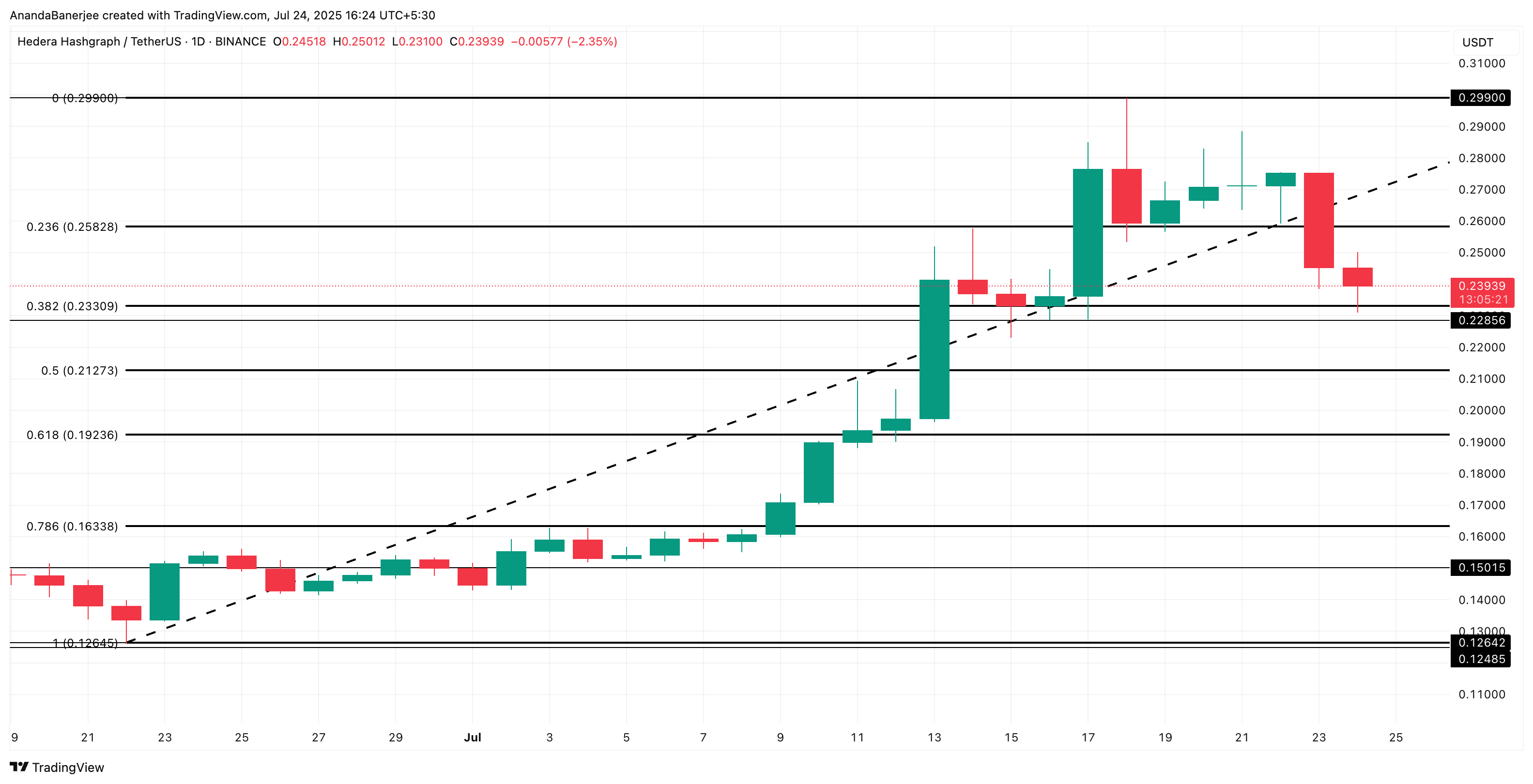 HBAR бағасы қазіргі уақытта $0,23 шамасында саудаланып жатыр, 0,382 Фибоначчи түзету деңгейінен сәл жоғары орналасқан, ол да $0,23 деңгейінде. Бұл сызық жақында $0,12 төменнен $0,29 жоғарыға дейін сызылған.