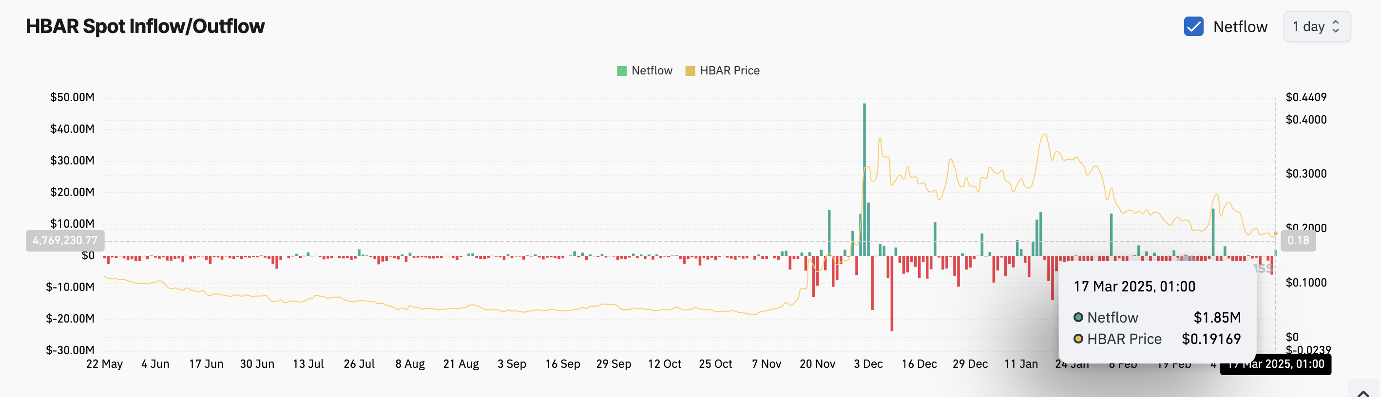 Он-чейн дерек провайдері бойынша, 11-16 наурыз аралығында альткоин тұрақты сату қысымына тап болды, споттық ағындар 10 млн доллардан асты. Бұл соңғы ағын нарық көңіл-күйінің бұқаға айналуын білдіреді, инвесторлар HBAR-ға қызығушылық танытқандықтан, мүмкін қалпына келу туралы болжам жасайды.
