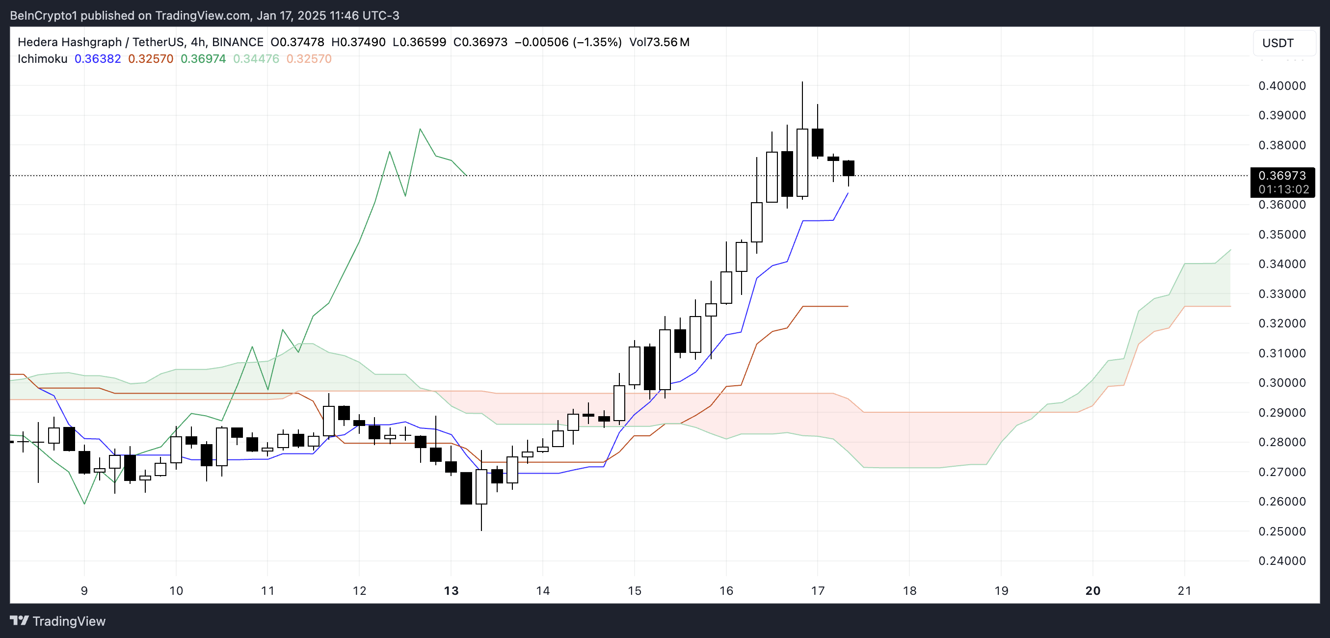 HBAR ichimoku cloud «бұқа» орнатылымының қалыптасуын көрсетеді