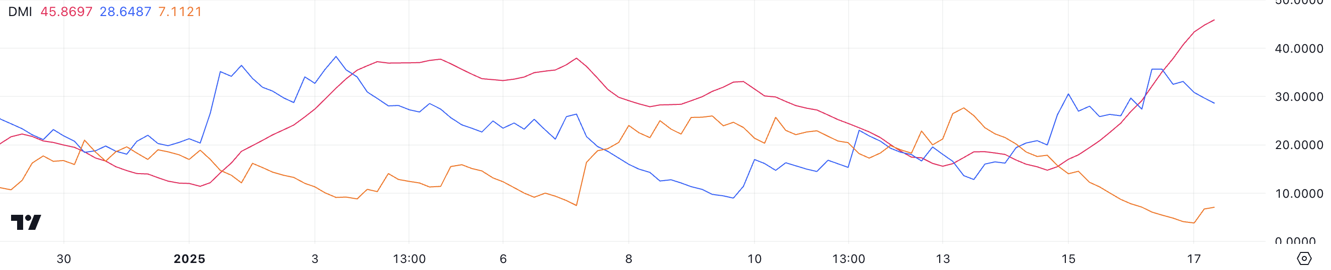 Hedera үшін DMI (Directional Movement Index) диаграммасы ADX (Average Directional Index) көрсеткішінің күрт өскенін көрсетеді, қазіргі уақытта 45,8-ге жетті, бұл екі күн бұрынғы 17-ден жоғары, сол кезде ағымдағы өсу басталды.