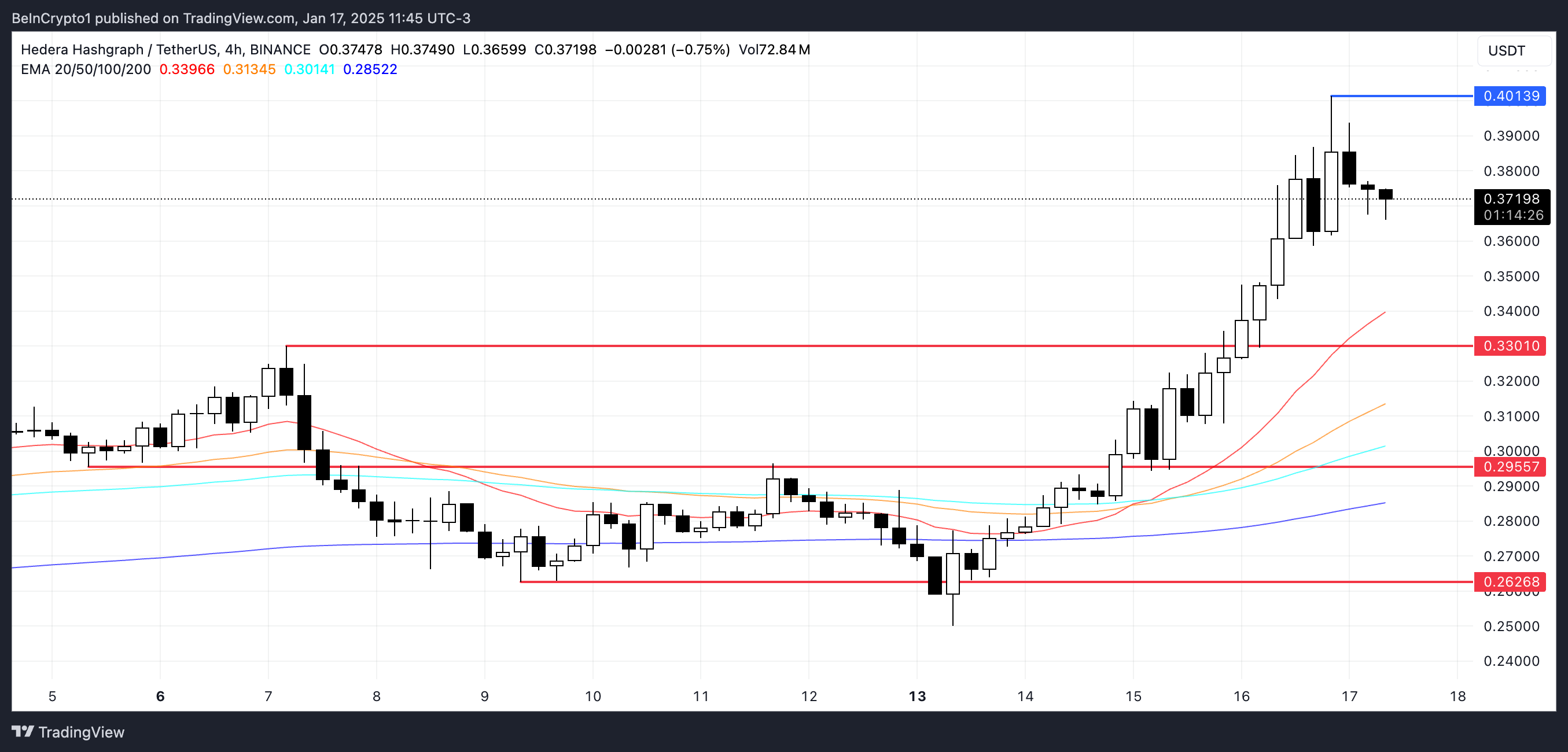 HBAR-дың EMA сызықтары өте өсу күйінде қалып отыр, қысқа мерзімді EMA-лар ұзақ мерзімділердің үстінде орналасқан және олардың арасында дені сау қашықтықты сақтайды. Бұл орналасу күшті өсу импульсін көрсетеді, бұл ағымдағы өсу тренді жалғасуы мүмкін екенін білдіреді. Егер сатып алу қысымы сақталса, HBAR 0,40 доллар деңгейіндегі қарсылықты сынауы мүмкін.
