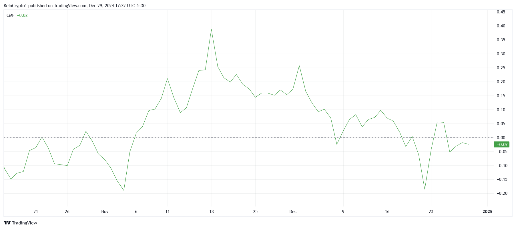 Chaikin Money Flow (CMF) индикаторы HBAR үшін кірістердің айтарлықтай төмендегенін көрсетеді, активте қазір шығыстар басым. Бұл өзгеріс инвесторлардың HBAR бағасының әрекеті мен оның өсу импульсін сақтап қалу қабілетіне қатысты белгісіздікке байланысты ақшаны шығарып жатқанын білдіреді.