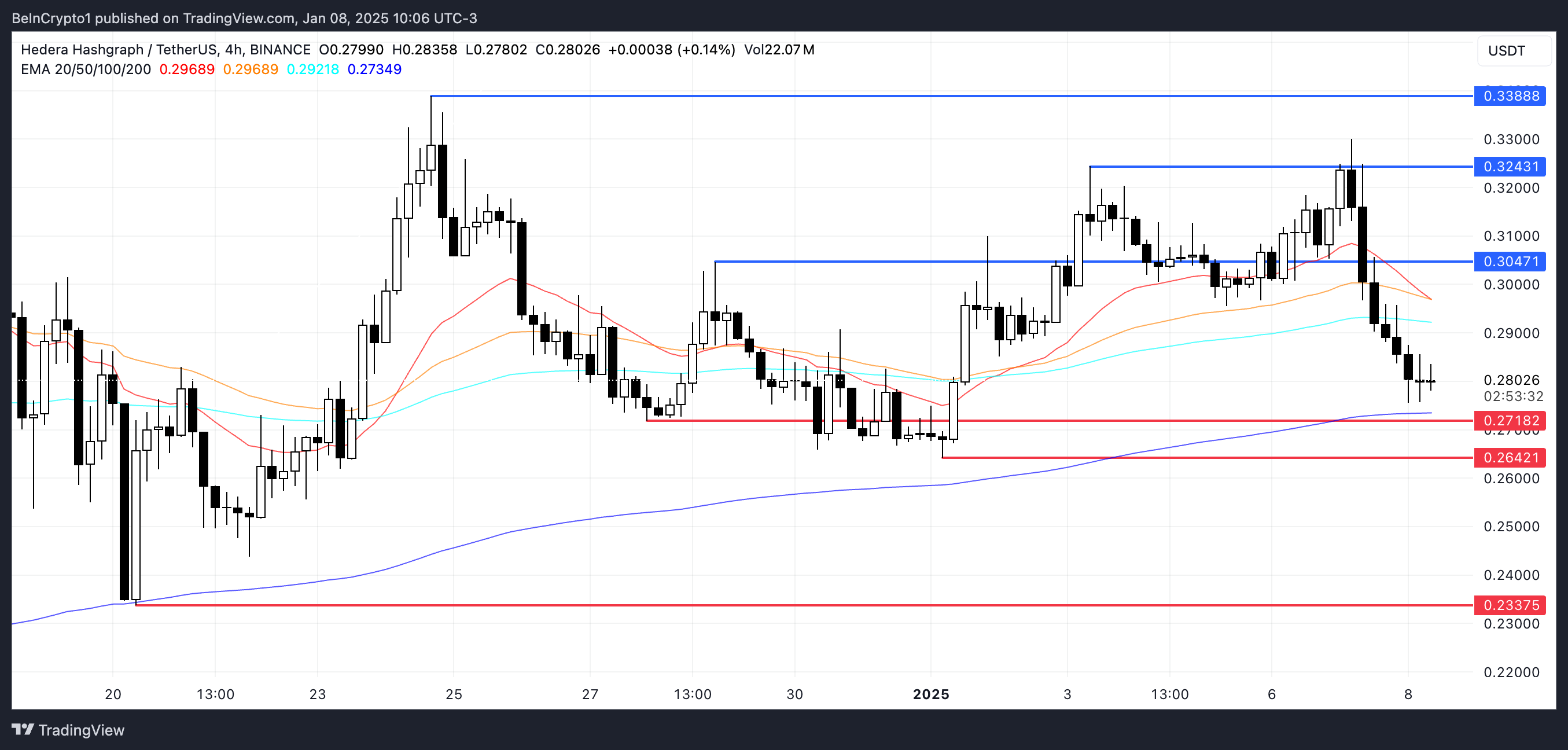 HBAR бағасы үшін EMA сызықтары ағымдағы түзетудің күшеюі мүмкін екенін көрсетеді, егер оның қысқа мерзімді EMA-лары төмендеуді жалғастырып, ұзақ мерзімді EMA-лардан төмен өтіп, өлім крестін құраса.