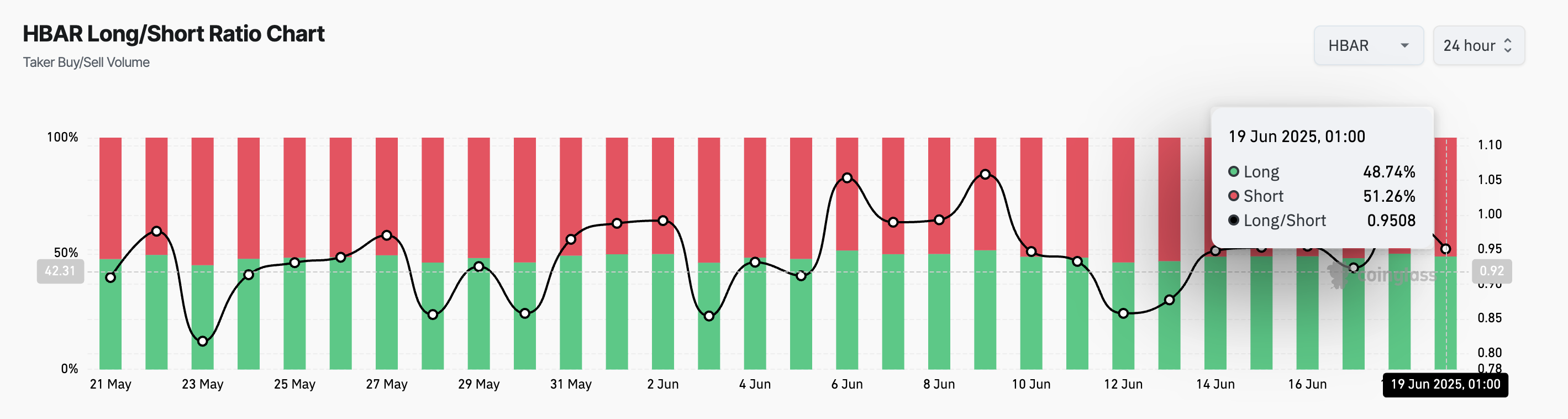 Coinglass мәліметтері бойынша, HBAR-дың ұзақ/қысқа қатынасы баспасөз уақытында 0,95 құрайды, бұл оның болашақ нарығында аюлық көзқарастың басым екенін көрсетеді.